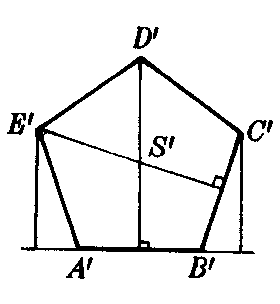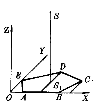 图3 画法 ❶画轴 画OX,OY,OZ轴; ❷画底面 画正五多边形A′B′C′D′E′,使它的边长为1.0cm,并作出它的中心S′(图1),在平面XOY中画出它的水平位置图形ABCDE及S′对应的点S1(图2); ❸画顶点 过S1作OZ轴的平行线段S1S,使S1S=2.0cm; ❹成图连结SA,SB,SC,SD,SE,加以整理,即可得到正五棱锥的直观图(图3). |