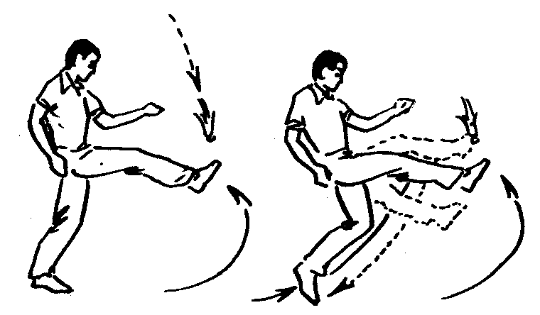 ❷)右脚上前一步,腿自然弯曲,上体稍后仰,身体重心移至右脚上,一手将毽球向前上方抛起。当毽球下落至胸前时,左腿先经前向上摆起,紧接着右脚踮地跳起,同时两腿空中(左腿向下、右腿向上)迅速交叉,勾脚尖由毽球前下向后上方击毽球。击球后,左右脚顺势依次着地。