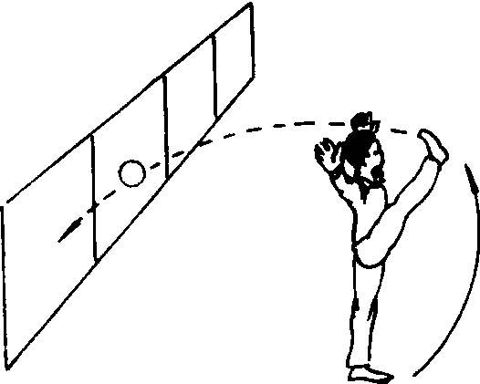 器材 小足球4个。 场地 在球墙上画4个高2米, 宽3米的球门。球墙前5米处画一条与墙平行的横线为起射点。 游戏方法 把学生分成6—10组, 每组4人。预备时,第一组4人分别站在起射线,各背对一个球门中间,手拿1个小足球。游戏开始,各自把球向空中抛起,然后迅速用正踢腿动作将球向后踢出。球打在球门以内得5分,不进球不得分。第一组做完后,按上述方法各组依次做,最后以全组积分高为胜。 游戏规则 ❶背向射门时,支撑腿要伸直,脚踢不可提起。 ❷踢球时必须勾脚触球。 |