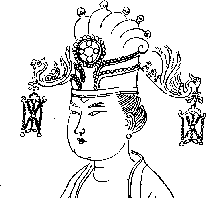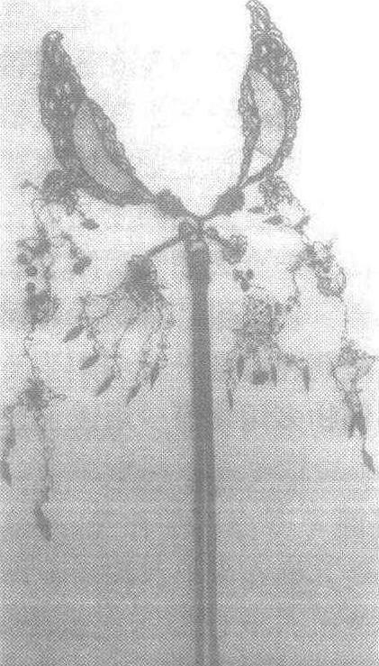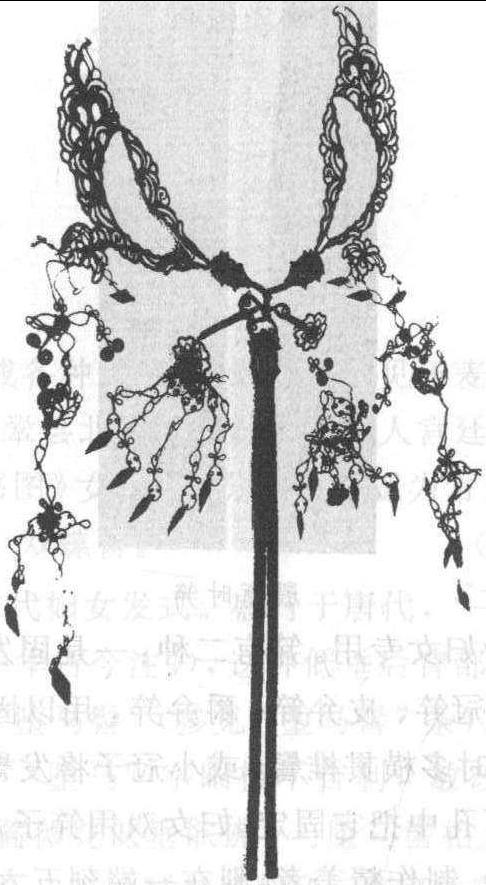 安徽合肥西郊五代墓出土步摇 步摇古代妇女首饰之一。着于发际,多以金制之,故又名“金步摇”。步摇上悬有垂珠,行步则摇,故名。始于汉,唐时称“百不知”,宋人称之为“禁步”。簪步摇时,行动要从容不迫,以使垂珠伴以玉佩发出有节奏的声响,以达到不见其人,先闻其声的效果。白居易《长恨歌》:“云鬓花颜金步摇,芙蓉帐暖度春宵”,即咏女子此种首饰。据载,杨贵妃的步摇极为华贵,是用丽水镇紫犀磨金琢成,上缀成串珠子,呈凤凰形。