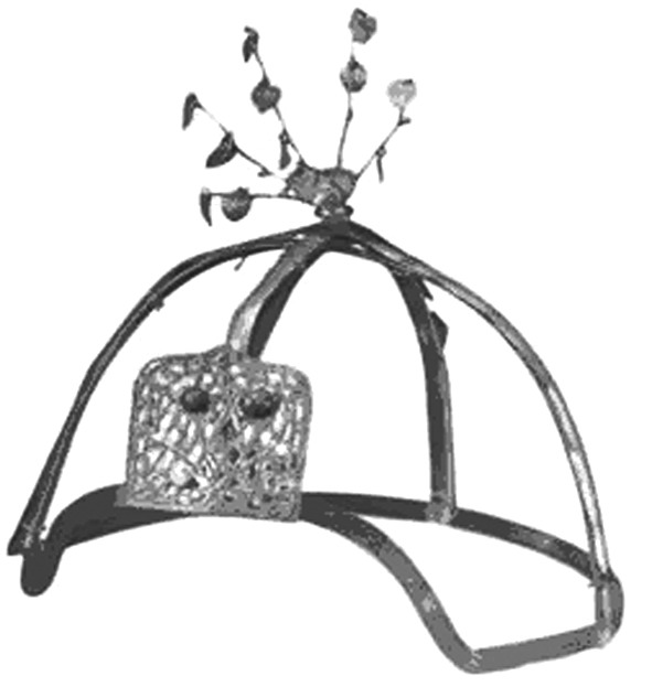 | 释义 | 步摇冠bùyáoguān装饰有步摇的冠,即在冠之上镶有像树枝、树叶状的金叶片或珠玉,走动即响。男女均可使用。《汉书·江充传》:“充衣纱縠襌衣,曲裾后垂交输,冠襌纚步摇冠,飞翮之缨。”《晋书·慕容廆载记》:“时燕代多冠步摇冠,慕容护跋见而好之,乃敛发袭冠,诸部因呼之为步摇,其后音讹,遂为慕容焉。”唐白居易《霓裳羽衣歌》:“虹裳霞帔步摇冠,钿璎累累佩珊珊。”明叶子奇《草木子》卷三:“元朝后妃及大臣之正室,皆带姑姑,衣大袍。其次即带皮帽。姑姑高圆二尺许,用红色罗。盖唐金步摇冠之遗制也。”