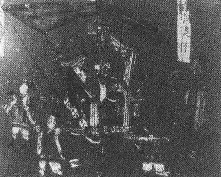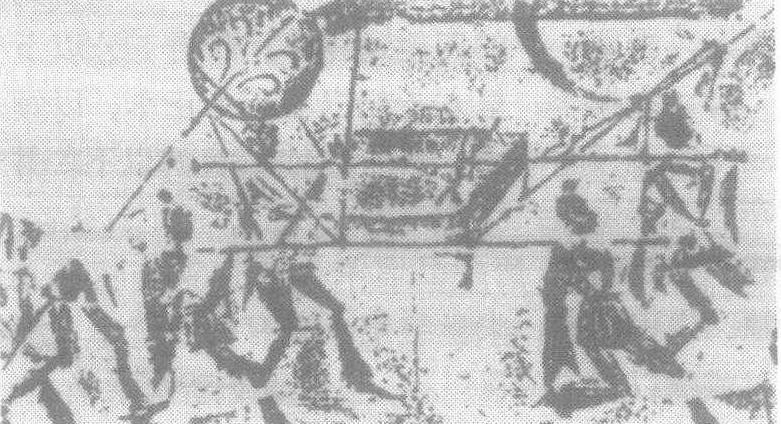 四抬低围栏榻式步辇画像砖拓片(南北朝) |