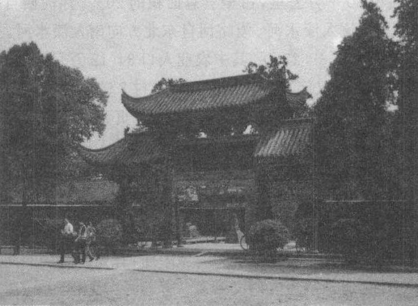278 武侯祠见07209条。 209 武侯祠三国蜀汉丞相武乡侯诸葛亮祠庙。位于成都南郊。西晋末年建。原与刘备汉昭烈庙相邻,明初并为一处。清康熙十一年(1672)重建。主要建筑有大门,二门,刘备殿,诸葛亮殿等。刘备殿中有刘备塑像,两侧有关羽、张飞、刘备之孙刘湛塑像,东西廊分列文官武将塑像各14尊。诸葛亮殿内有诸葛亮,其子诸葛瞻、孙诸葛尚像。殿前有诸葛鼓三面。祠内还藏有大量历史文物。 武侯祠❶在四川成都南郊,面积三万七千平方米。成(汉)李雄为纪念诸葛亮而建的祠庙园林。初与刘备昭烈庙相邻,明初祠并于庙,故大门横额为 “汉昭烈庙”。现存殿宇为清康熙年重建。祠内古柏葱郁、环境幽雅,青瓦红墙,殿宇宏伟。
