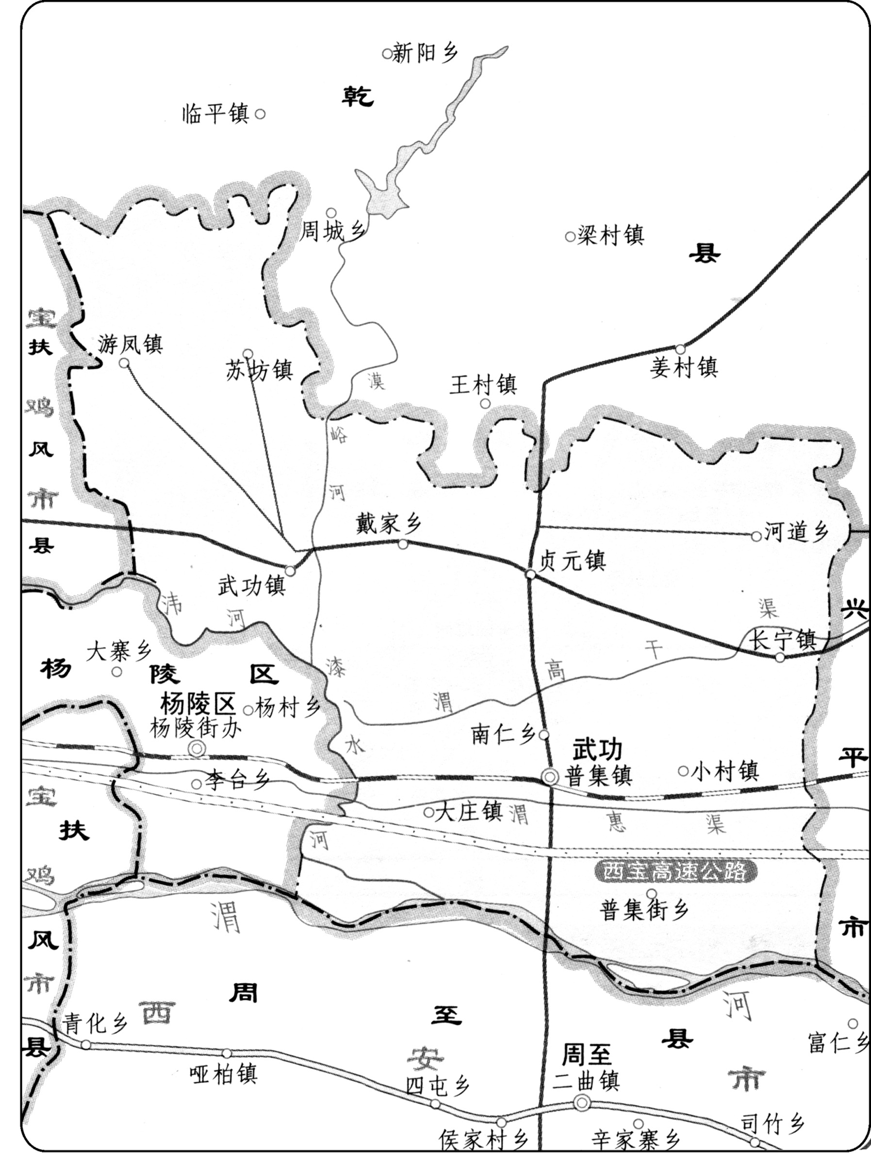 武功县政区图 武功县咸阳市辖县之一。位于咸阳市西郊50公里处。东到兴平,西至扶风,南与周至隔河相望,北与乾县接壤。面积392平方公里,其中耕地42.86万亩。地势北高南低,以平原为主。有三种地貌形态,一是河谷冲积阶地,二是黄土台原,三是山前洪积扇前缘洼地,当地人习惯称作一、二、三道原。海拔最高603米,最低411米,县城海拔420米。暖温带大陆性气候。年平均气温12.9℃,积温4143℃,一月均温-1.4℃,七月均温26.2℃,极端高温42℃。年日照2196小时。年降水量667毫米。夏季多雷雨,秋季多连阴雨。无霜期228天。气候比较干燥。境内水系主要有渭河、漆水河、漠峪河和𣲗河。渭河沿县境南端蜿蜒东流,境内流长27.7公里。年平均流量170~200立方米/秒,最大流量7000立方米/秒,流域面积90平方公里,占全县总面积的22%。漆水河由北而南,境内流长20公里,年平均流量4.7立方米/秒,流域面积80平方公里,占全县总面积的20%。𣲗河西自扶风入境,流入漆水河。漠峪河自东北方向南入漆水河。全县常住人口37.27万,其中农业人口34.12万。境内居民绝大多数是汉族。辖普集、武功、小村3镇和游风、苏坊、观音堂、长宁、固、普集街、代家、贞元、河道、南仁、大庄、北营12个乡,349个自然村。县人民政府驻普集镇。 武功县(古) 秦孝公时(前361—前338)设置,因武功山、武功水得名,故址在眉县东20里古城村,辖区约为今眉县、岐山县渭河以南地区,太白区东部及周至县西部。汉平帝元始五年赐给王莽为采邑,改名汉光,新莽居摄元年改名新光。东汉永平八年(65)迁置故城,故址在咸阳市杨陵区永安村,辖区约为今咸阳市杨陵区、武功、周至2县地,扶风县东南部,眉县和岐山县渭河以南地区及太白县东部,魏晋因之,北魏太平真君七年(446)废。北周建德三年(574)在中亭川复设武功县,故址在今武功县西北20公里武功镇,辖区约为今武功县及杨陵区。金大定二十九年(1189)改名武亭县。元至元元年(1264)复名武功县。1958年12月撤销县制。1960年9月复设,并迁治普集车站,即今武功县普集镇。 武功县咸阳市辖县。位于陕西省中部、黄河支流渭河北岸。陇海铁路经过境内。战国秦置美阳县,治所在今武功县西北武功镇。秦属内史。西汉属右扶风。北魏移治今扶风县东南。北周天和四年(569年)复移治今武功县西北武功镇;建德三年(574年)置武功县,治所不变,属扶风郡。金大定二十九年(1189年)改武功县为武亭县,属乾州。元复名武功县,属奉元路。明清属乾州。民国初属关中道,1928年属陕西省。1958年废,入兴平县。1961年复置武功县,移治今武功县(普集镇)。 |