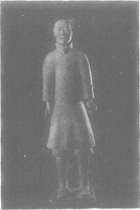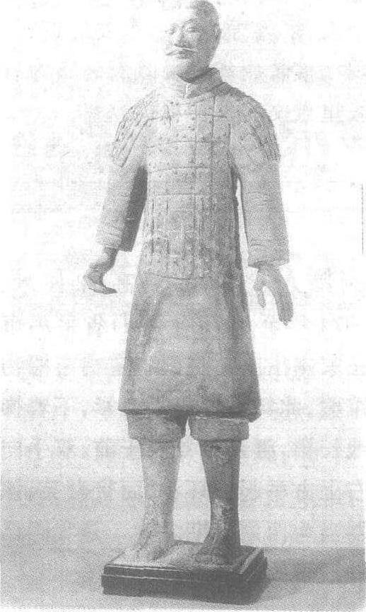 武士陶俑秦。高180厘米。陕西省临潼县秦始皇兵马俑1号墓出土。陕西省临潼秦始皇兵马俑博物馆藏。此俑为一铠甲武士,身躯威武高大,穿短褐,外披铠甲,腿扎行縢(即绑腿),足蹬方头履。左手作按剑状,右手半握似持物。头梳发髻右偏,蓄八字胡须,颧骨较高,双目凝视前方,面带微笑,昂首挺立,透出机智聪敏。此俑不仅在神态上刻画细腻,铠甲的制作也十分精致,上面铆钉和相互连接的金属丝都一一可见,显示了秦代制陶工艺的高水平。秦始皇兵马俑见“跪射武士陶俑”条目。