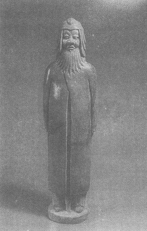 武士陶俑隋。通高74.3厘米。上海博物馆藏。俑头戴盔帽,外穿整齐的披风式长袍,为一武士。眉骨粗大,双目圆睁,紧闭的双唇具有刚毅的轮廓线,浓密的长须垂于胸前。作者在创作时未完全采用写实技法,而是进行了一定的夸张。武士的五官给人以大而硬的感觉,脸部和鼻翼的肌肉绷得很紧,甚至长须也带有装饰性,显得规整而有力。这种适当的艺术夸张突出了武士的坚强和勇猛,收到了良好的效果。俑的通身施颜色较深的黄釉,增添了沉稳之感。
