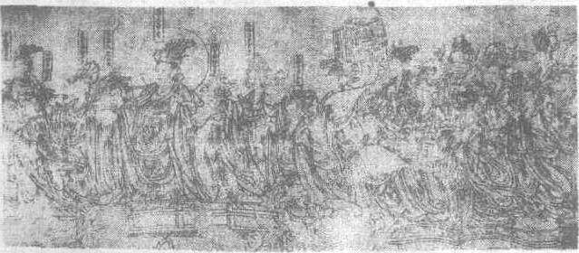 朝元仙仗图 武宗元 武宗元北宋画家。生年不详,1050年去世。河南白波(今河南省孟津县)人。擅画佛道鬼神,学吴道子得“云行水流”的笔法。17岁画北邙山老子庙壁画。1007年,名为一时之冠。作有《朝元仙仗图》卷(上绘88个人物,44.3cm×580cm)。 |