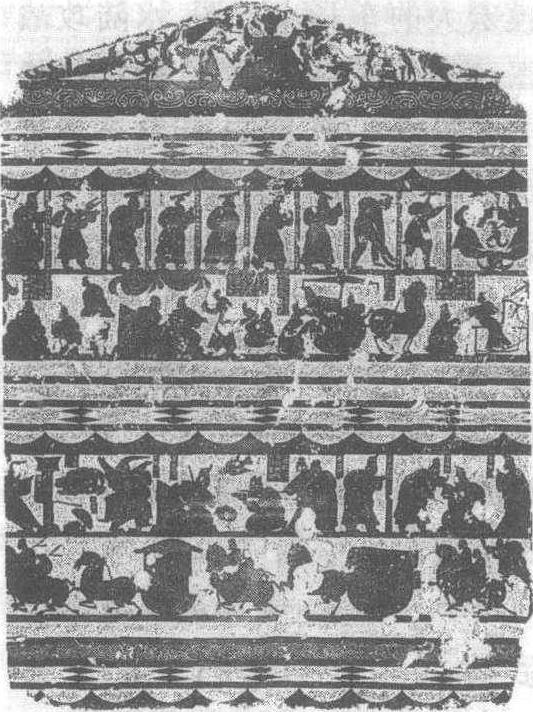 | 释义 | 武梁祠西壁画像石东汉。长184厘米,宽140厘米。山东省嘉祥县出土。嘉祥县文物保管所藏。此画像石顶为锐角状,其面由波浪纹、菱形纹、圆弧纹、绳纹等分成五层,内刻饰不同的神话、历史故事等。顶层中间为端坐的西王母(神话人物,亦称金母,王母或西姥。在《山海经》里,她是一个豹尾虎齿而善啸的怪物。在《穆天子传》里,则是一个雍容平和,能唱歌谣的妇人。此外象《汉武内传》,《神异记》等,均对其进行了不同的描述),其两旁环以羽人、玉兔、蟾蜍及各种灵异。第二层自右向左依次为伏羲、女娲、祝融、神农、黄帝、颛顼、帝喾、尧、舜、禹、桀。亦即传说中的开天辟地者及三皇五帝像。其旁皆有榜题。其中伏羲、女娲合为一幅,作交尾状,黄帝以下至舜着冕旒作帝王像,夏桀则一手执戈,坐于两个女子身上。图像虽简约,但褒贬十分鲜明。第三层为“曾母投杼”,“闵子骞御车”、“老莱子娱亲”,“丁兰刻木”等教子、孝子故事,第四层为“曹子劫桓”,“专诸刺王僚”,“荆轲刺秦王”的忠臣侠士故事。第五层为一列向左行驶的马车队(亦或为出行图)。此画像石内容丰富翔实,自宋代发现以来,备受研究者重视。