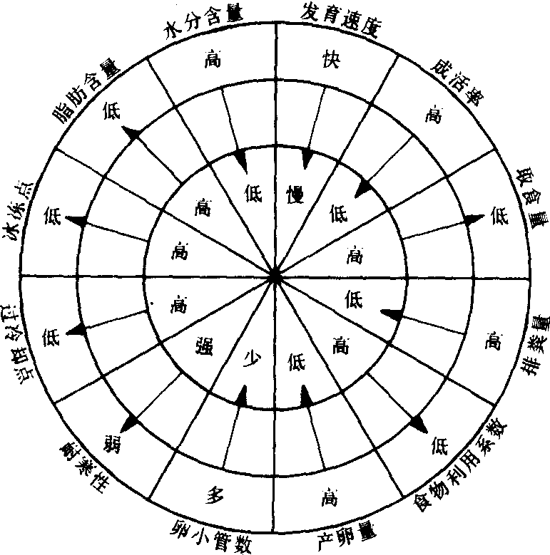 图2 蝗蝻各龄期胸部及部分腹部的侧面观 东亚飞蝗喜食麦、粟、玉米、高粱、稻及芦苇、稗草、红草等禾本科作物及杂草,饥饿时也取食大豆、油菜、向日葵、棉等,但不取食甘薯、马铃薯、麻类及田菁等。东亚飞蝗自日出后半小时开始取食,16~17时为取食高峰,日落后渐少;大发生时,夜晚也有取食现象,温度低于15℃或高于38℃时,取食量显著下降或停食。食物不同对东亚飞蝗的生长速度、成活率及生殖的快慢高低都有影响。以红草、稗草、爬根草、高粱、小麦为食者发育好,生殖力高。在其一生累计总食量中,如以含水量较高的玉米为食,鲜重约为80克,如以含水量较低的芦苇为食料,鲜重约为60克,如以干重计算,食玉米叶者为20克;食芦苇叶者约为13克左右。一般情况下,成虫期食量约为蝻期的3~7倍,东亚飞蝗对已食取的食物利用率为23~60%。 迁移是东亚飞蝗适应环境的行为特征,也可视为调节种群数量与空间分布的对策。群聚多发生在晴天日出后1小时,日落前半小时停止聚集。蝗蝻群聚与日光及温度关系密切,开始群聚的地表温度在23℃上下,低于15℃或高于40℃均无群聚现象,28~37℃为最适群聚温度。阴、雨、风天不群聚。蝗蝻在一定空间内的种群密度大小,是发生群聚与否的主要原因。高密度的蝗蝻经过一定时间的群聚生活,可形成群居型的蝗蝻及成虫;相反,如在一定空间内的种群密度很低,则不易群聚,常成散居型蝗蝻及成虫。扩散与迁移也是东亚飞蝗的重要生物学特性,蝗蝻龄期愈大,跳跃扩散与迁移能力愈强。东亚飞蝗的扩散和迁移因素,除种群自身的活动能力外,还受食物、地形、气候、水文、天敌等自然因素和人为活动所影响。成虫能作远距离迁飞,这一行为对蝗区的变更和种群分布的调节,繁殖速率的变化都有很大影响。在正常天气情况下,羽化后5~10天性器官成熟。当性器官将成熟时,成虫在晴天傍晚多作飞翔活动,每次振翅飞翔1小时左右,长者可达3小时以上。性成熟前的飞翔活动有促进性器官成熟的作用,也是最容易发生迁飞的时期。成虫静止时体温与环境温度接近,飞翔开始阶段的体温迅速增加,在5~15分钟内达到最高值。雌虫体温最高可超过环境温度8℃,雄虫可超过6.9℃。维持短暂时间后,即明显降低并趋于稳定或缓慢下降。成虫飞翔速度,羽化3~4天的成虫为0.31~0.71米/秒,羽化一周后为1.45~2.5米/秒。成虫不仅群居型可结群远距离迁飞,散居型成虫也常在傍晚作较长距离迁飞。经远距离迁飞降落后即行交配产卵,成为迁入地地区猖獗发生的虫源。 夏蝗成虫自羽化至性成熟历时9~14天,秋蝗7~12天,秋蝗雌虫一生中交配可达20~25次,最多达40次以上,每次交配持续4~5小时,最长达16~18小时。首次交配后经4~7天开始产卵。每次产卵间隔夏蝗为4~6天(24~28℃),秋蝗为5~9天。在天气晴朗,平均气温达32℃条件下,产卵间隔最短仅3天。一天中,产卵盛期常在13~17时,在土中产卵深度最浅约2.4厘米,最深达6.3厘米,一般为4~6厘米。整个产卵过程需60~90分钟。每头雌虫可产卵4~5块,最高达12块,平均一生产卵粒总数300~400粒,最多者夏蝗达1 014粒,秋蝗达592粒。喜在坚实的土内产卵,而在松土内产卵的机会较少。最适宜产卵的土壤含水量为10~20%。在含水量低于5%或高于25%土壤中产卵量显著减少。通常表土氯离子含量在0.2~1.2%之间为产卵繁殖的适宜环境,多数蝗卵产在含盐量0.5%以下的土中。能产卵的土表最低含盐量为0.3%,高于1.2%时,则不产卵。能进行孤雌生殖,但产卵前期、产卵间隔和雌蝗寿命较长,且产卵率和孵化率低,幼蝻均为雌性,生长发育正常,羽化后仍可交配产卵或继续孤雌生殖。 飞蝗的变型学说是苏联乌瓦洛夫(B.P.Uvarov)于1921年提出的。东亚飞蝗群居型与散居型在生物学上有明显差异。群居型的脂肪含量、结冰点、过冷却点、取食量、食物利用系数以及活动力均高于散居型,而含水量、产卵量、排粪量和成活率则低于散居型(图3)。