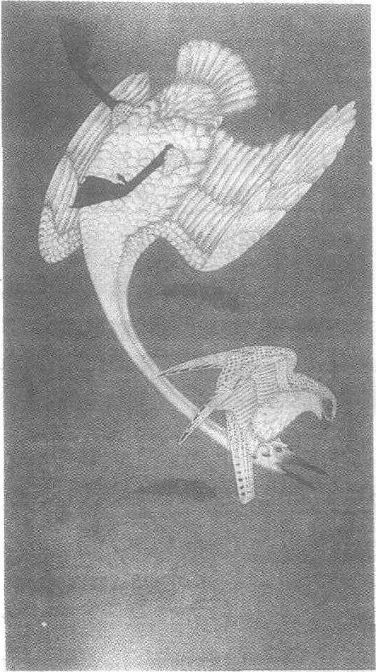 | 释义 | 殷偕鹰击天鹅图轴明。殷偕绘。绢本设色。纵158厘米,横89.6厘米。江苏省南京博物院藏。殷偕,字汝同,画家殷善之子,金陵(今江苏南京)人,生卒年代不详。绘花卉翎毛,能传父艺。此图以工笔重彩描绘了一只凶猛的苍鹰扑击天鹅的情景。苍鹰目光敏锐,坚啄如钩,身形小巧而矫健,它的利爪紧紧抓住天鹅的头部,扇动翅膀,伸嘴欲啄。天鹅突然被袭,顿时失去了平衡,翻跌下落,它一面哀叫,一面扑翅甩尾,踢蹬争扎,但这一切都显得力不从心,无济于事,鹰爪下的天鹅的眼神中充满了凄楚惶惧之色。背景中湖水微茫,坡草隐约,纤长的芦荻在晚风中轻轻摇曳。画家运用对比的手法突出主题,幽湖草坡以淡墨轻勾,浅彩略染,苍鹰与天鹅则先用润墨绘出轮廊,再以白粉细描毛羽,明丽雅洁,茸茸可爱,与晦暗的背景形成了强烈对比。构图简洁,笔法细腻,禽鸟造型优美,神态逼真,苍鹰的挚猛与天鹅的软弱都表现得十分生动。图中钤有<锦衣都指挥殷偕>朱文方印,及<御用大监韦氏家藏珍玩>收藏印。