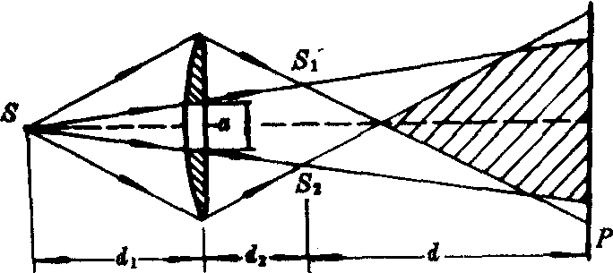 | 释义 | 比累对切透镜实验bilei duiqie toujing shiyan一种双光束分波面干涉实验。比累(Billet)所做。把一块凸透镜沿着直径切成两块半截透镜,再把两块半截透镜沿垂直于光轴的方向拉开一段距离a,空隙用不透明屏遮住,点光源S放在上述装置的对称轴上。S发出球面波,上、下波阵面的光线分别射向两块半截透镜,折射成两束光。观察屏P位于两束光的重叠区域(图中阴影部分内),屏P上呈现双曲线状的明暗相间条纹。S通过两块半截透镜成象,所成的实象为S1和S2,可以认为两束光是分别从它的发出的,因此,S1和S2相当于杨氏实验中的双孔。设S到透镜的距离为d1,凸透镜的焦距为f,则实象S2(或S2)到透镜的距离为d2=fd1/(d1-f),S1和S2之间的距离为b=a(d1+d2)/d1。