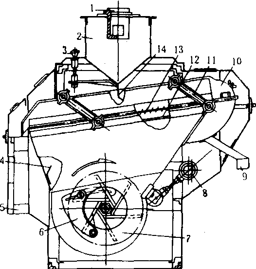 吹式比重去石机 1.进料口 2.进料斗 3.进料调节手轮 4. 导风板 5. 出料口 6.进风调节装置 7.风机 8. 偏心传动机构 9. 出石口 10.精选室 11. 吊杆 12. 匀风板 13.去石筛面 14. 缓冲匀流板 |