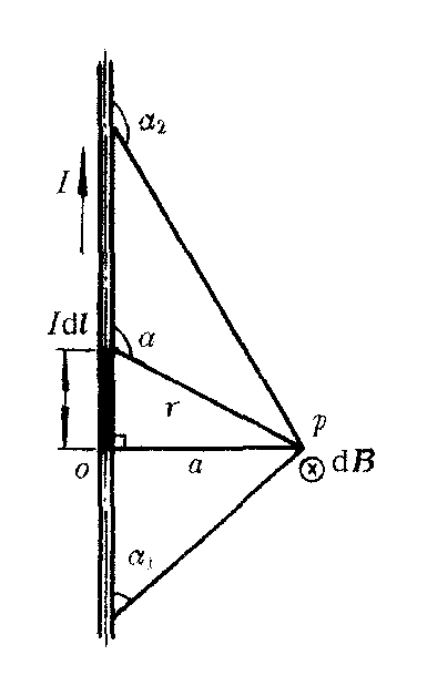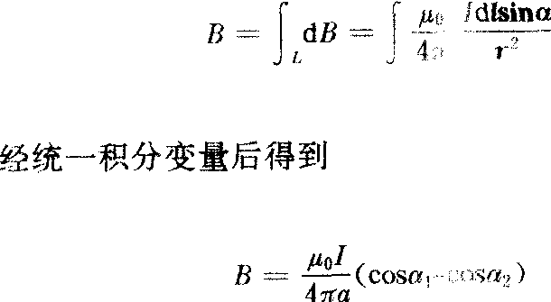 式中积分遍及全体电流元。毕奥—萨伐尔定律是描写电流元所产生的磁场的定律,与静电场中库仑定律的地位相当。它是静磁场中的基本定律,由它出发可推出磁场的两个重要定理,即磁场的高斯定理及安培环路定理。在普通物理阶段,可应用毕奥—萨伐尔定律,通过积分求磁感应强度B。例如,❶可求载流直导线的磁场。设导线长L,电流为I,P点至导线的垂直距离为α,见图2。在距o为l处取电流元⨜dl,它到P点的矢径为r,dl与r夹角为α。导线上各元段在P点的dB方向相同,均垂直指向纸内,于是可将矢量积分改变为标量积分 ![]() 若导线可视为无限长,则B=μ0I/2πa;若为半无限长,则B=μ0I/4πa。可看出,对于可视为无限长载流导线的电流I,产生的磁场的B只与a有关,a相同处,B也相同。在与电流垂直的各平面内,B线是以电流为中心的同心圆。 ❷载流圆线圈轴线上一点P的磁场可用类似的方法到圆心的距离。轴线上各点的磁感应强度都沿轴线方向,与电流方向组成右手螺旋关系。在圆心处,x=0,于 ![]() ❸载流直螺线管轴线上一点的磁场,可求出为B=μ0nI/2(cosβ2-cosβ1),若螺线管可视为无限长,则得B=μ0nI,式中n为单位长度上的匝数。