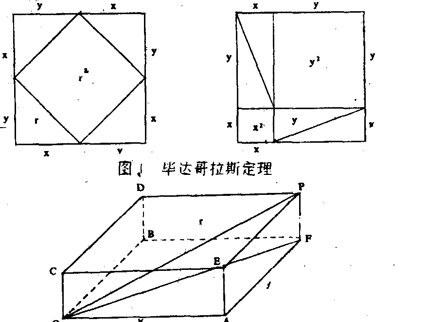 | 释义 | 毕达哥拉斯定理bidagelasi dingli参见“勾股定理”. 毕达哥拉斯定理这个定理说明,在任何直角三角形中,斜边上的正方形面积等于另两边上的正方形面积之和:r2= x2+ y2,欧氏平面几何中这个极为重要的定理,是以公元前六世纪希腊哲学家和数学家毕达哥拉斯命名的,它已有100余种证明方法,其中一个证明是由比较图1中正方形的面积而得到的。 |