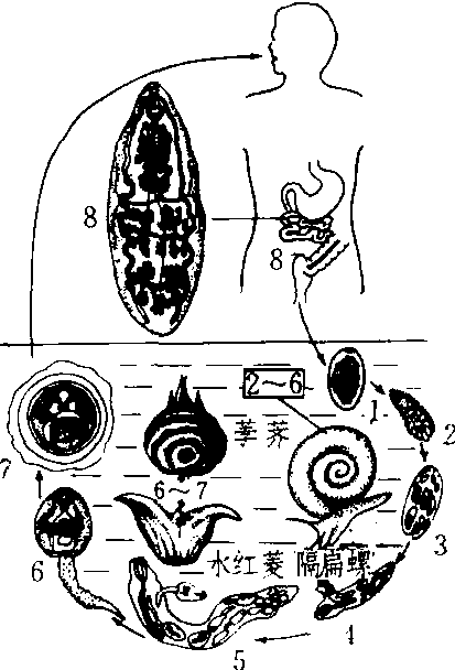 布氏姜片虫生活史 1.卵 2. 毛蚴 3.胞蚴 4. 第一代雷蚴 5. 第二代雷蚴 6. 尾蚴 7. 囊蚴 8. 成虫 |