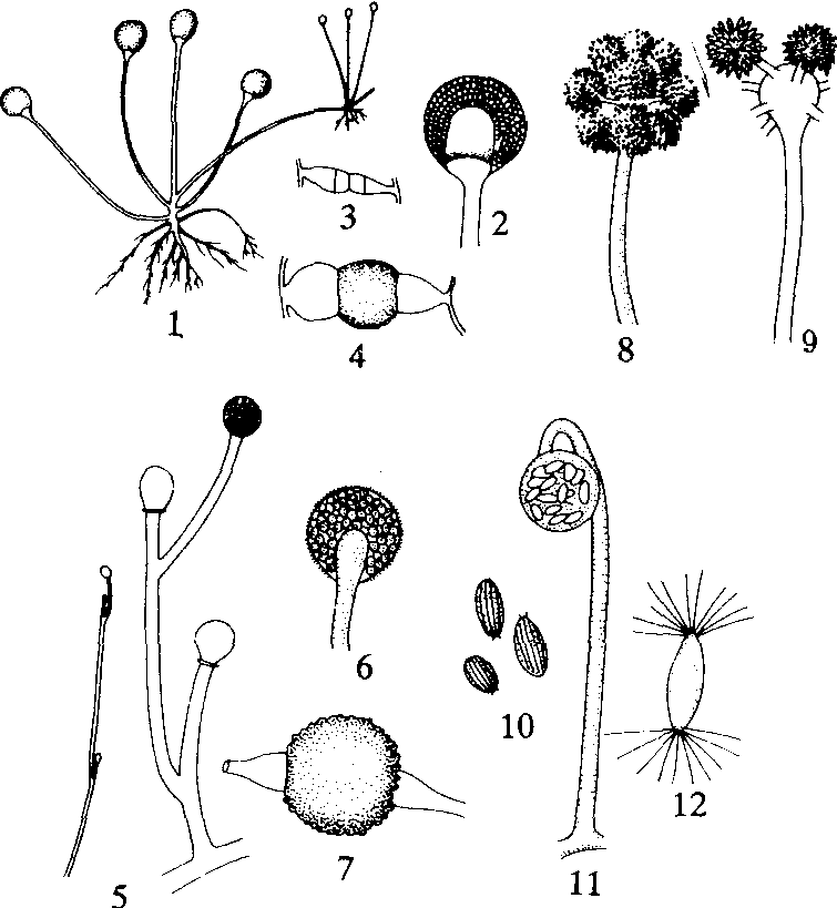 根霉属(Rhizopus Ehrenber ex Corda) 菌丝无隔膜,有假根和匍匐枝,假根相对处向上长出孢囊梗;孢囊梗单生或丛生,分枝或不分枝,顶端产生孢子囊;孢子囊球形,囊轴明显,基部有囊托,成熟后壁消解或破裂; 孢囊孢子球形、卵形或不规则形,有棱角或线纹,无色至淡褐色; 接合孢子表面有瘤状突起,配囊柄无附属丝。匍枝根霉[R stolonifer (Ehrenb. ex Fr.)Vuill]引起甘薯软腐病及瓜果蔬菜的收获后病害。 毛霉属(Mucor Mich ex Fr.) 菌丝无隔膜,无假根及匍匐枝; 孢囊梗单生、直立,单轴或假单轴分枝,顶端生孢子囊; 孢子囊球形,有囊轴,无囊托,内生大量孢囊孢子; 孢囊孢子圆形或椭圆形,无色或有色,表面平滑; 接合孢子表面有瘤状突起,配囊柄无附属丝,萌芽时产生芽孢子囊,有的产生厚垣孢子。广泛分布,腐生于土壤、粪便和其他有机物上。在贮藏条件不良时,可引起谷物、果实及薯类的霉烂。 笄霉属(Choanephora Currey) 有孢子囊和小型孢子囊,分别着生在各自的孢囊梗上。孢子囊有囊轴,内有大量形状不一的孢子,孢子褐色,有条纹及毛状附属丝; 小型孢子囊生在球形的泡囊上,内有2~5个孢子,孢子卵形至纺锤形,暗褐色,有条纹及毛状附属丝。有时形成厚垣孢子。有些种形成接合孢子。常见种是引起瓜类花腐病的瓜笄霉[C.cucurbitarum(Berk et Rav.) Thaxt.]。 毛霉目Mucorales接合菌亚门,接合菌纲。菌丝无色至淡褐色、无隔膜、多核,部分菌丝转化成繁殖器官的基部或衰老菌丝可产生隔膜,有些种可产生厚壁孢子、假根和匍匐菌丝,菌丝体繁茂。无性繁殖时可产生大小两型孢子囊,多顶生在孢囊梗上,大型的内生许多孢囊孢子,囊内常有凸出的囊轴,囊轴形状多种,有或无囊托,小型的内生少数或一个孢囊孢子,一般无囊托。孢囊梗多单枝,少数的有不同形式分枝。有性生殖时,由两个配子囊结合产生近球形、壁厚、平滑或有纹饰、暗色的接合孢子。陆生或腐生,极少数种营弱寄生,引致瓜果、薯块等植物贮藏器官腐烂。本目有毛霉科和笄霉科等14科,含根霉属、毛霉属和笄霉属等50余属。 |