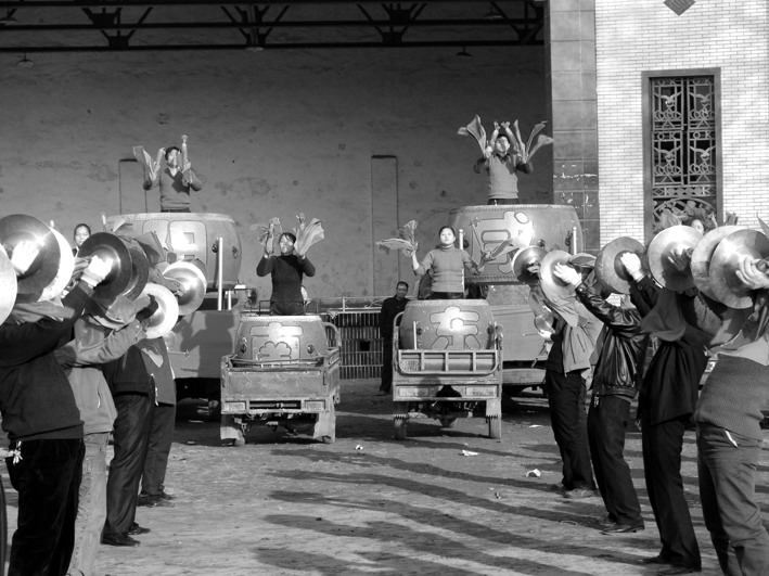 | 释义 | 民间锣鼓乐minjiɑn luoɡuyue民间传统社火之一。流传境内各地,种类繁多。建国前称为“社”或“同乐会”。建国后则由各地村委会承办。据1955年统计,全市锣鼓队多达1000余个,演奏人数逾万名。著名艺人和曲目有秦都利民锣鼓队鼓师郑明寿父子演奏的牛拉鼓《什样锦》,兴平桑镇锣鼓队鼓师赵俊明演奏的《风凰单闪翅》,兴平大阜锣鼓师高教养演奏的《十面埋伏》,永寿监军锣鼓队鼓师南俊彦演奏的《五样》,淳化润镇锣鼓队演奏的《赛鼓》等。民间锣鼓乐随着时代发展不断变化,如牛拉鼓由过去牛拉车改为大卡车,鼓师舞姿造型亦有创新。民间鼓乐谱均以师承传授“锣鼓经”,集演奏与伴奏锣鼓于一体,既可独立演奏,又可为社火、舞蹈伴奏。大型民间锣鼓乐多是套曲结构,中型是回旋曲体或三段体,小型则是一段休添花加点的自由反复,如淳化赛鼓,或称老鼓,以“九点十三翻”的打法而著名。九点是赛头、滚绣球、硬三翻、软三翻、双击边、三点锣、双采头、单采头和三步头九乐段组成。此外又加共用乐段“鸭子拦嘴”和“小翻”。演奏时依其顺序,将“小翻”插入,并在“滚绣球”、“三点锣”、“双采头”之后,必须加“鸭子拌嘴”,依次结合,共13个乐段,演奏13次,每次称为一翻。比较有名的有秦都利民锣鼓队、渭滨锣鼓队、兴平大阜锣鼓队、永寿监军锣鼓队、城关西村锣鼓队,乾县大王、姜村、梁村锣鼓队、淳化润镇锣鼓队等。