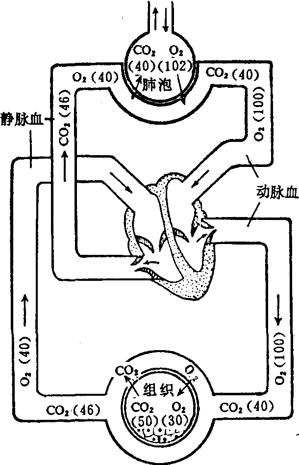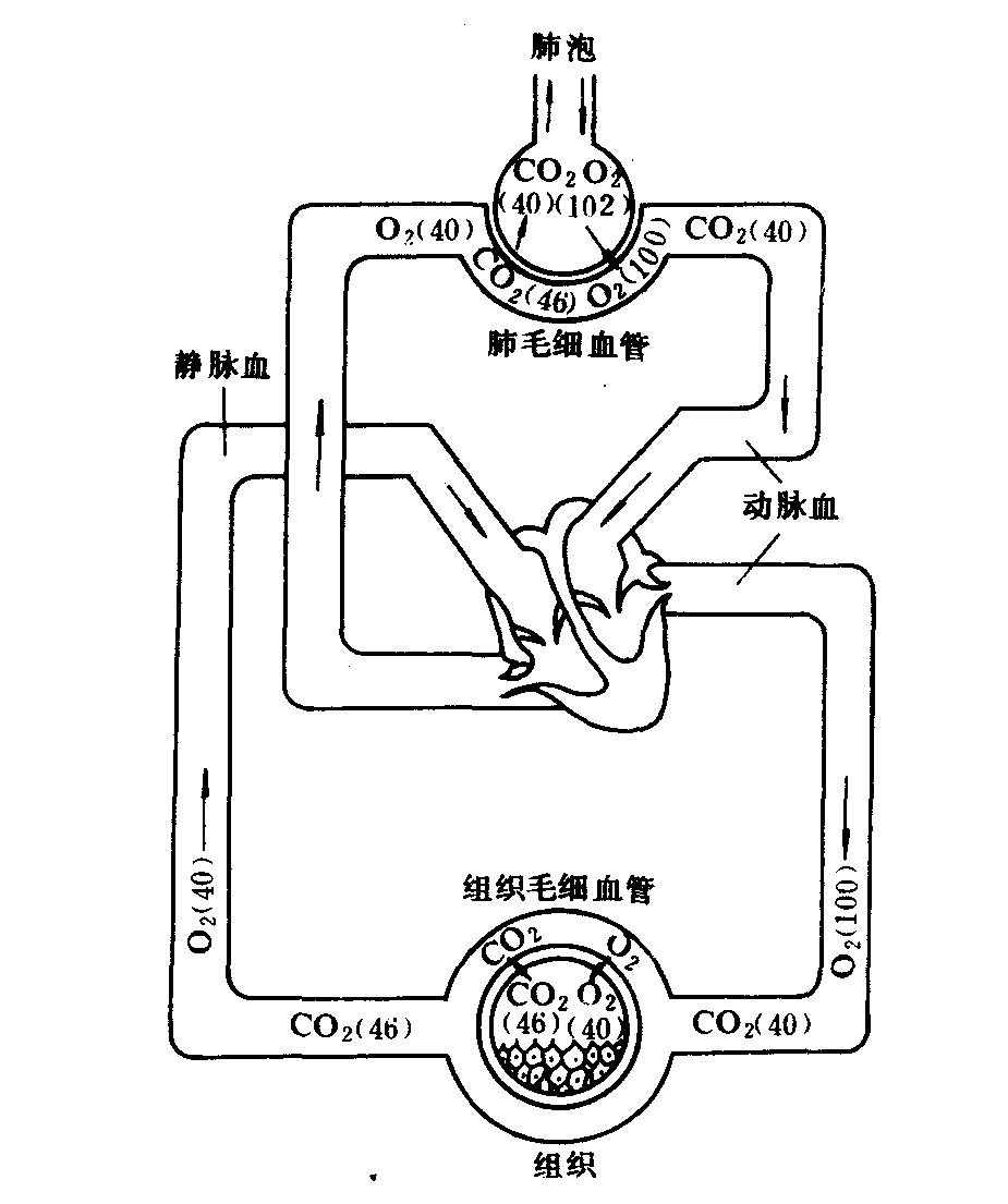 图1-16 气体交换示意图 (数字为气体分压mmng) 肺泡与血液间的气体交换 亦称肺换气。肺泡内的氧分压(102毫米汞柱)高于静脉血氧分压(40毫米汞柱),所以氧从肺泡扩散到静脉血。肺泡中二氧化碳分压(40毫米汞柱)低于静脉血二氧化碳分压(46毫米汞柱),所以当血液流经肺泡时,血液中的二氧化碳便向肺泡扩散。这样经肺换气后,使含二氧化碳多而含氧少的静脉血,变为含氧多而含二氧化碳少的动脉血。由于不停地进行呼吸运动,使肺泡中的气体成分保持相对稳定,即氧分压较高,而二氧化碳分压较低,从而保证了肺换气的不断进行。 血液与组织间的气体交换 亦称组织换气。由于组织细胞在代谢中不断利用氧和产生二氧化碳,故其氧分压较低(30毫米汞柱)而二氧化碳分压较高(50毫米汞柱)。于是氧由血液向组织扩散,而二氧化碳则由组织向血液扩散,结果使动脉血变成静脉血。由于组织细胞的代谢过程不停的消耗氧并产生二氧化碳,故组织内的氧分压始终低于动脉血,而二氧化碳分压则始终高于动脉血,从而使组织换气也能不停地进行。 气体交换量的多少主要与气体分压差有关,分压差越大,气体交换量越大。此外还与肺泡及毛细血管开放的数量有关,开放的数量越多,进行气体交换的面积越大,气体交换量也越大。 体内氧和二氧化碳分压(毫米汞柱)