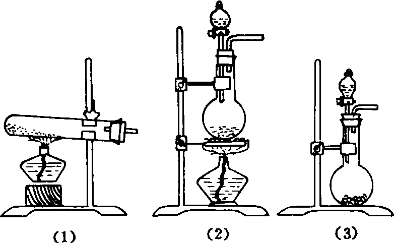 | 释义 | 气体制备装置qiti zhibei zhuangzhi实验室中制备气体时,根据反应物的状态和反应条件,常采用如图所示装置。图 (1) 适用于固体加热反应制气体,如制取氧气、氨气、甲烷等。图 (2) 适用于固体与液体或两种液体反应制气体,如制取氯气、氯化氢、二氧化硫、一氧化氮、二氧化氮、乙烯等。图(3) 适用于固体与液体常温下制气体,如制取氢气、二氧化碳、硫化氢、乙炔等。此外,制气装置还有启普发生器 (参见“启普发生器”) 及其他简易装置等。