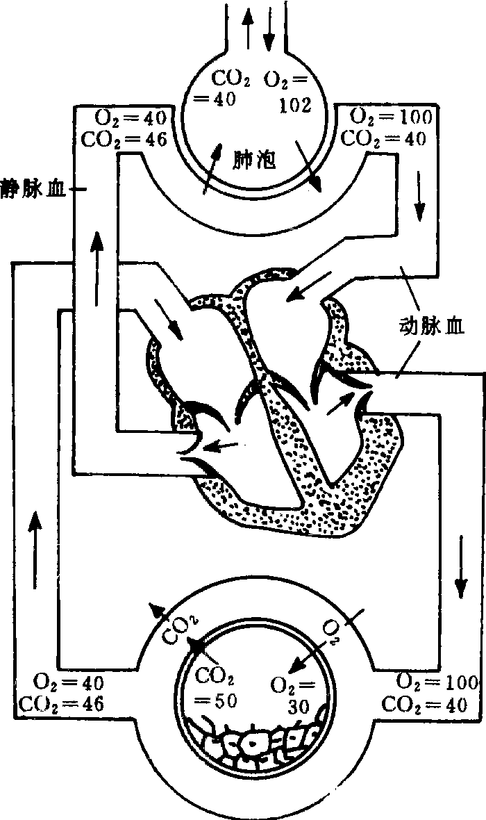 图1.6-8 氧和二氧化碳的交换和运输数字代表分压(毫米汞柱) |