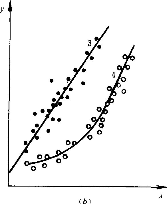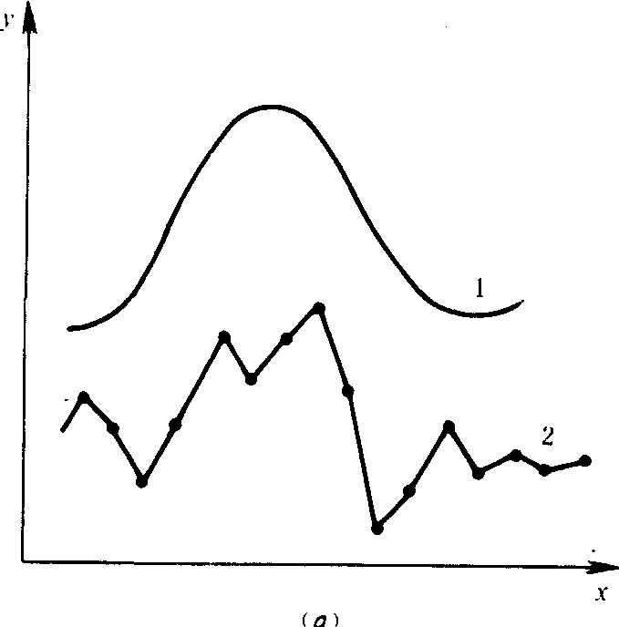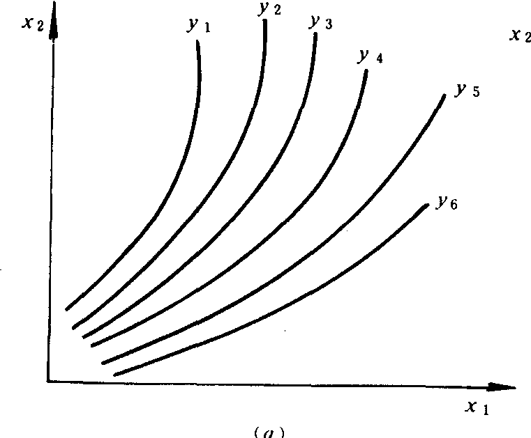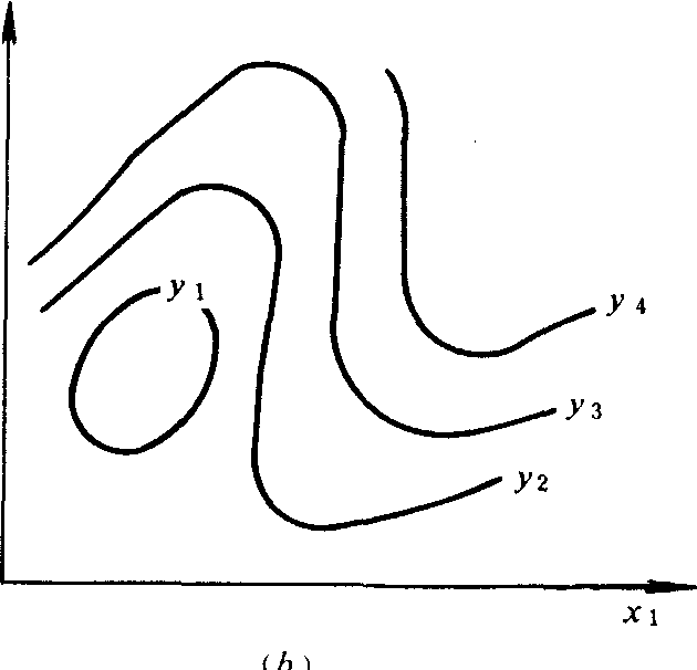多要素线条图 常见的是两个要素的等值线图和各种点聚图(图2)。分别以两个影响因子(要素x1、x2)作为直角坐标,被研究的要素(y)以散布点加注数值的方式,点绘在直角坐标图中,然后按散布点所标数值(y)大小,绘制等值线y1、y2……yn。在联系比较紧密、单调的情况下, 等值线簇具有某种规律性,称为等值线图。若联系比较复杂,则等值线形式也较复杂,称为点聚图。绘制这类图时,要求影响因子x1、x2与所研究要素(y)有较紧密联系,同时x1、x2之间要尽量互相独立。两个以上影响因子的线条图在直角坐标图上已无法绘制,一般要求把多余的影响因子限定在某一范围内(即取常数), 然后绘制等值线图或点聚图。气候要素时空剖面图等也属于这一类。