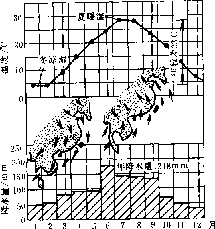 气候分析中还绘制综合图(包括各种线条图、直方图以及各种符号), 以综合反映气候, 如图4。该图反映出上海的年降水量和气温年变化, 以及中国东部沿海地区的冬、夏两季的盛行风方向。
