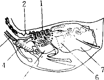 禽气囊分布图 1.肺 2. 颈气囊 3. 气管 4. 锁骨气囊 5.胸前气囊 6.胸后气囊 7.腹气囊 |