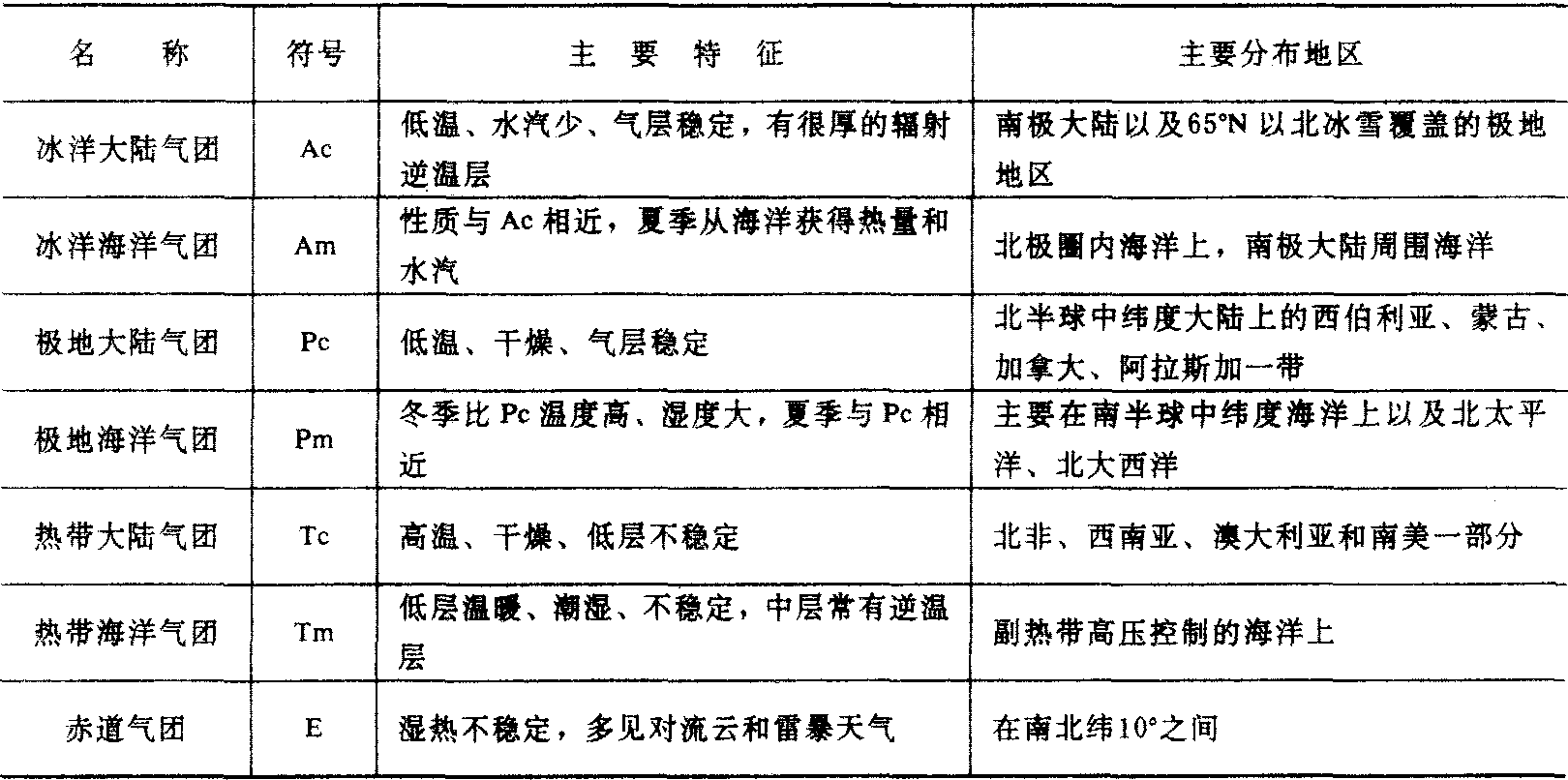 在天气预报中还常常根据气团与流经地区的温度对比状况把气团划分为暖气团和冷气团。当气团温度高于流经地区温度时称暖气团;低于流经地区时称冷气团。气团是一种比较简单的天气系统,又是其他天气系统形成的基础,在气候学和地理科学中广泛应用。 气团qituanair mass水平方向上热力性质比较均匀而范围较大的空气。气团的水平范围为几百到几千公里,厚度为几公里至十几公里。形成于热力性质比较均匀的广阔下垫面上。空气的热力性质指温度、湿度和气层的垂直稳定度。按温度可分为冷气团和暖气团;按湿度可分为干气团和湿气团,或称大陆气团和海洋气团;按气层的垂直稳定度可分为稳定气团和不稳定气团;按气团形成源地的地理位置可分为冰洋气团、极地气团和热带气团等。气团离开源地后,热力性质发生变化,称变性气团。冷气团移到暖的下垫面,底层空气先变暖,气层稳定度减小,乱流和对流容易发展;暖气团移到冷的下垫面,底层空气先变冷,气层稳定度增加,乱流和对流不易发展,而相对湿度增加,有时会出现雾和层云。由大陆移至海洋的气团容易获得海面蒸发的水汽而变湿,由海洋移至大陆的气团要发生凝结才变干。影响中国天气的气团,主要有来自西伯利亚干而冷的极地大陆气团和来自太平洋、南海或印度洋上暖而湿的热带海洋气团。后者是造成中国降水的主要水汽来源。气团概念为20世纪20年代挪威气象学派所提出。1938年涂长望,1948年张丙辰等曾对影响中国的气团做过系统的研究。 气团Qituan对流层中,具有某些共同物理性质,并在大气环流系统内,作为一个整体而移动的大气块。是水平方向上温度、湿度等气象要素差异很小的大范围空气团。其水平范围大致由几百公里到几千公里,垂直范围可由几公里到十几公里,相当于对流层顶的高度。在同一气团中,由于物理属性比较一致,所出现的天气基本类似。但在不同气团中,所出现的温度、湿度和天气却是不同的。特别是在两种气团交界的地区,天气变化最为剧烈(参阅“锋”条)。气团长时间在单一地理环境影响下,如湿润的太平洋洋面或寒冷的西伯利亚陆面,通过乱流作用与下垫面进行热量和水汽交换,以及气团本身在各高度上进行辐射冷却或增温,使大范围空气取得下垫面的温湿特征,从而形成具有该地区特性的气团。在地球上,气团存在的固定地方称为气团源地。气团是在高气压区形成的,因空气在高压区停留的时间较长,受地面性质的影响较大。当环流条件发生变化时,气团就要离开源地移入新的环境。气团移动时保持其本身的特性,在移动过程中,气团受不同下垫面影响,与途经地区进行热量和水分的交换,又会慢慢地变性。离开源地的时间愈长,路程愈远,气团的变性程度也就愈深。气团有冷热之分,当它比其移经地区为暖时称暖气团;为冷时称冷气团。暖气团移来时,可使到达地区的天气变暖;冷气团移来时,可使到达地区的天气变冷。根据气团形成的源地,又可将气团分为下列几类(如表所示)。我国大部分处于中纬度地区,是冷暖气团交绥的地区,地表性质又复杂,因此不能成为气团的源地,而多为变性气团。冬季主要是受变性的极地大陆气团和变性热带海洋气团的影响;夏季主要受变性的极地大陆气团、热带海洋气团、热带大陆气团的影响。 气团的地理分类表