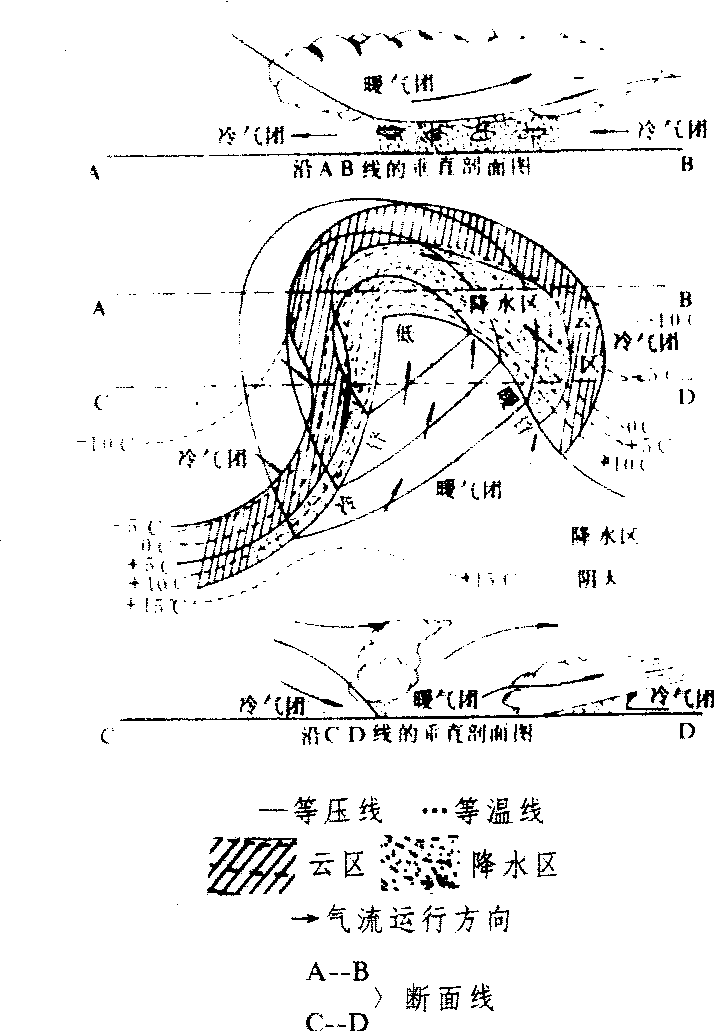 锋面气旋天气模式 我国温带气旋的活动地区与高空锋区分布相关联。一个与北支锋区相对应,活动在蒙古到我国东北一带;另一个与南支锋区相对应,活动在长江流域到日本南部一带。气旋是产生大范围降水、大风等天气现象的天气系统,是温带地区的重要天气系统。 气旋qixuancyclone水平流场上具有闭合等压线、中心气压低于四周, 而气流在北 (南) 半球呈逆(顺)时针旋转的大型涡旋,是流场上的一种天气系统,在气压场中称为低压。按温度场特征, 气旋分为冷性气旋、暖性气旋和锋面气旋。气旋中心的气温低于四周的为冷性气旋, 中心气温高于四周的为暖性气旋,气旋内存在明显气团界面的称做锋面气旋。由于两等压面之间, 空气温度较低的区域空气密度较大, 则气柱较短, 反之则气柱较长, 由此推知, 冷性气旋则愈到上层愈强, 暖性气旋则愈到上层愈弱, 甚至转变为反气旋。锋面气旋一侧气温较高, 另一侧气温较低,气旋中心位置随高度的增加而偏向冷空气一侧。气旋近地面都有气流辐合, 有利于上升运动的产生, 是易于生成云和降水的天气系统, 有时伴有强风暴、强对流等剧烈天气现象。 气旋Qixuan中心气压比四周低的水平空气涡旋。又称低气压,简称低压。因受地转偏向力的影响,在北半球气旋中空气绕中心作逆时针旋转(如图所示);南半球气旋中空气绕中心作顺时针旋转。气旋的形状近似于圆形或椭圆形。强度通常用中心气压值和最大风速来表示,中心气压值越低,最大风速越大,则气旋越强。其大小以地面图上最外一条闭合等压线的范围来量度,水平尺度一般有1 000公里,大者可达2 000—3 000公里,小者只有200—300公里。地面气旋中心的气压值多在1 010—970百帕之间,发展强大者可低于935百帕,海洋上曾有的低到920百帕。气旋按生成的地理位置,可分为温带气旋和热带气旋(参阅“温带气旋”、“热带气旋”各条)。气旋对中纬度地区的天气演变有重要影响,由于气旋区盛行上升气流,故多云雨天气。气旋活动形成的气旋雨,是我国降水的主要类型之一。