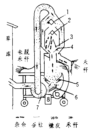 气流清选脱粒机 1.上挡料器 2. 下挡料器 3.风料分离筒 4. 第二分离器 5. 第一分离器 6. 集粮盘 7.风机 8.粮箱 |