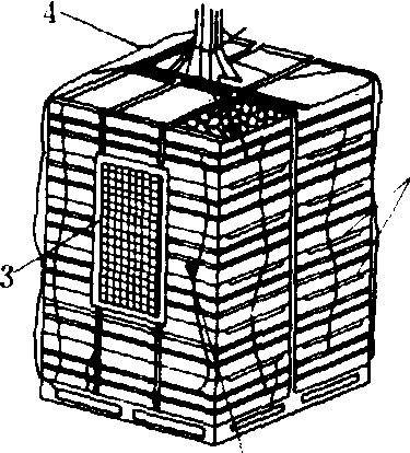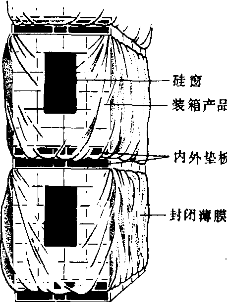 图1 塑料薄膜垛封法示意图 MA贮藏,袋封形式多样,有小袋封装、大袋封装、紧缩包装(热缩薄膜封装时受热收缩紧贴于产品)、硅窗集装袋(可大可小,硅窗也可用于薄膜帐上)(图2)。袋封一般都属于MA贮藏。薄膜封闭贮藏目前多用聚乙烯或无毒聚氯乙烯薄膜。这类薄膜的强度和弹性较高,化学性质较稳定,可以热合粘结,应用比较方便,但透气性差。很薄的聚乙烯膜可用于小包装短期贮藏。硅橡胶(聚二甲基硅氧烷基橡胶)薄膜具有特殊的透气性能。这种薄膜对二氧化碳的渗透系数要比聚乙烯膜大250倍,比聚氯乙烯膜大二万多倍;对氧的渗透系数要比聚乙烯膜大200倍。硅橡胶膜的透气性还有高度选择性,它透过二氧化碳的速度为氧的6倍,为氮的12倍;对乙烯和一些芳香物质也有较大的透性。将硅橡胶涂于化纤布上,做成一定面积的气体交换窗,镶嵌在封闭薄膜上,虽降低了一些透气性,但增加了牢固度,可起自动调气作用。80年代以来,日本研制成功一种醋酸乙烯树脂(EVA)新型薄膜,其透气性和透湿性都比低密度聚乙烯好,用以包装蔬菜,袋内不出现凝结水,也不易发生二氧化碳中毒。