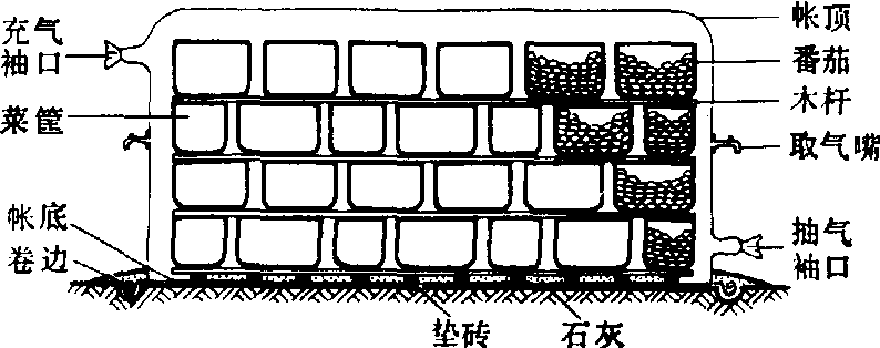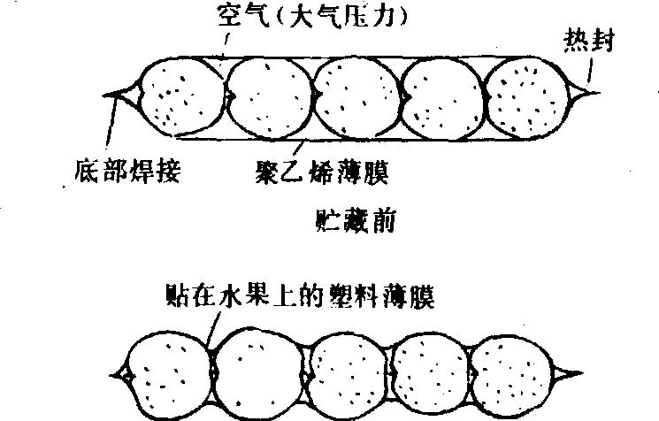 气调方式 早期的气调贮藏都是自发气调。即利用原有冷库加以密封改造, 随后塑料薄膜成了较小规模、方便适用的密封材料, 出现了薄膜小包装贮藏和大帐堆藏或垛藏。再后,在这些塑料薄膜制成的帐、袋上装置了硅橡胶膜调气窗。 塑料袋小包装贮藏 自20世纪40~50年代发现塑料薄膜有一定的透气性,可依靠袋内果实的呼吸作用,吸收氧放出二氧化碳和水, 使袋内氧含量降低, 二氧化碳增加, 再借助于薄膜对氧、二氧化碳和氮的一定透性和对水分的不透性, 使袋内的气体成分和湿度达到或接近设定指标, 适于水果保鲜。苹果、香蕉、梨、桃、柿以及柑橘等均可采用(图1)。但不同的水果对塑料薄膜的要求不同。塑料薄膜的透气性和透水性与袋内外的各种气体成分的分压差有关, 也与其种类、结构、密度、成膜的方式(吹塑或压延)、薄膜厚度、在膜上打孔的情况和是否与其他材料复合成膜等方面密切相关。一般其透性在膜的结构中, 结晶区小于非结晶区。因此, 在一定面积的膜上, 结晶区越大, 其透性就越差。聚氯乙烯的透气性小于聚乙烯,厚的比薄的小。一般依果实种类选用0.02~0.07毫米规格的薄膜。