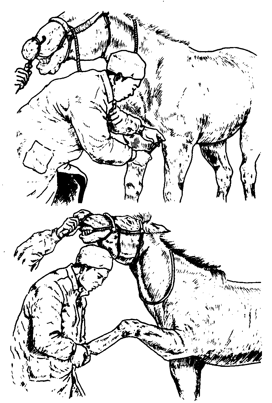 提皮进气法 最常用的穴位是弓子穴, 用以治疗前臂肌肉萎缩、肩膊痛等。具体方法是将穴位剪毛消毒, 用大宽针刺破皮肤后, 术者双手配合用力提起穴位周围皮肤, 再随即放松皮肤, 如此反复, 让空气随着皮肤一提一放进入穴位皮下, 并用手渐渐挤压进入的空气充塞于病变部位皮下。最后用碘酊棉球按揉消毒针孔。术后注意不要让患畜剧烈运动, 防止气体散失影响疗效。若需第二次治疗, 须间隔10天以上。