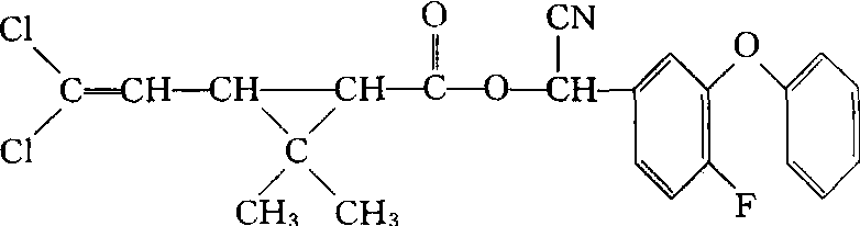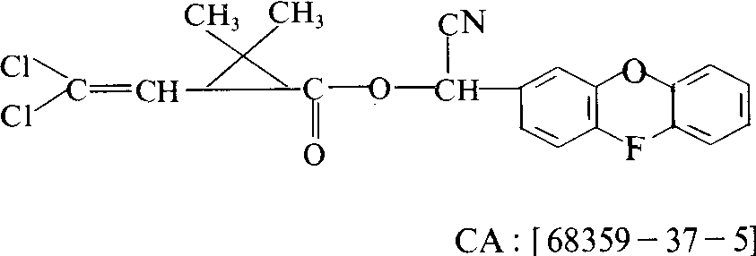 性能 纯品为无色结晶,不同的光学异构体熔点不同,原药为棕色含有结晶的粘稠液体,含有效成分90%以上,加热至60℃以上时变为黄棕色透明油状液体,无特殊气味,密度d1.27~1.28,20℃时蒸气压小于1×10-3帕。对光稳定,酸性介质中较稳定,碱性介质中易分解,当pH值大于7.5时就会被分解,常温下贮存两年不变质。几乎不溶于水,易溶于丙醇-2、二氯甲烷、已烷、甲苯等有机溶剂。对高等动物低毒,原药对大鼠急性经口LD50约为600毫克/千克,对大鼠急性经皮LD50大于5000毫克/千克,对大鼠急性吸入LC50(1小时)大于1089毫克/米3。对兔皮肤无刺激作用,对眼睛有轻度刺激作用。在试验剂量内对试验动物未发现致畸、致突变和致癌作用。用含有50毫克/千克氟氯氰菊酯的饲料喂养大鼠两年未发现有害影响。对鱼类等水生生物、蜜蜂、家蚕高毒,对鸟类毒性较低。杀虫活性高,属神经毒剂,具有触杀和胃毒作用,对植物组织有有效的渗透作用,无内吸传导和熏蒸作用。药效迅速,残效期较长,对作物安全。杀虫谱广,对鳞翅目、半翅目、鞘翅目、双翅目等多种害虫有效,对一些地下害虫也有效,对螨类有一定的抑制作用,但不作为专用杀螨剂使用。 应用 加工成乳油、超低容量液剂、可湿性粉剂、颗粒剂等剂型使用。主要用于棉花、蔬菜、果树、茶树、烟草、旱粮、大豆等作物,防治各种蚜虫、棉铃虫、棉红铃虫、菜青虫、桃小食心虫、柑桔潜叶蛾、茶树茶尺蠖、茶毛虫、烟青虫、旱粮粘虫、玉米螟、地老虎、大豆食心虫等,对棉叶螨有一定的抑制作用。施药要均匀,不与碱性药剂混用,对钻蛀性害虫应在幼虫蛀入作物前施药。还用于贮藏产品、草皮和卫生等方面害虫的防治。防治卫生害虫采用滞留喷雾。 氟氯氰菊酯cyfluthrin又称百治菊酯、百树菊酯、bagthroid。化学名称:α-氰基-3-苯氧基-4-氟苄基(1R、3R)-3-(2,2-二氯乙烯基)2,2-二甲基环丙烷羧酸酯。化学结构式如下。原药为棕色黏稠的液体,密度1.27~1.28,20℃时蒸气压<99.99×10-5Pa。微溶于水,易溶于有机溶剂。大鼠经口LD50(♂)为550~750 mg/kg(♀)为1 200 mg/kg,小鼠(♂)为300mg/kg、(♀)为600 mg/kg。对鱼类剧毒,鲤鱼LC500.01 mg/L,对蜜蜂有毒。可以防治棉、果树、蔬菜及其他经济作物害虫,主要是鳞翅目幼虫。