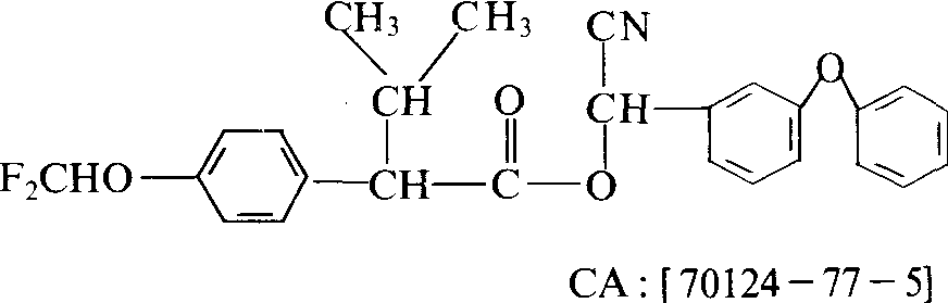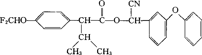 性能 原药为暗琥珀色粘稠液体,有轻微的酯味,沸点108℃/46.7帕,25℃时蒸气压为1.2×10-6帕,密度d224 1.19。对光稳定,弱酸性介质中较稳定,碱性介质中易分解,27℃在pH3缓冲液中半衰期40天,pH5缓冲液中半衰期52天,pH9缓冲液中半衰期6.3天,在37℃正常条件下贮存稳定期一年以上,25℃正常条件下贮存稳定期两年以上。难溶于水,易溶于丙醇、丙酮、玉米油、棉籽油、豆油、己烷、二甲苯等有机溶剂。对高等动物毒性中等,原药对大鼠急性经口LD50为81毫克/千克(雄)、67毫克/千克(雌),对兔急性经皮LD50大于1000毫克/千克,对兔皮肤、眼睛无刺激作用。在试验剂量内对试验动物未发现致畸、致突变和致癌作用。对人体每日允许摄入量(ADI)为0.02毫克/千克。对鱼类等水生生物、蜜蜂、家蚕高毒,对鸟类低毒。杀虫活性高,属神经毒剂,具有触杀和胃毒作用,无内吸传导和熏蒸作用。药效迅速,残效期较长,高温下杀虫活性不减退。杀虫谱广,对鳞翅目、鞘翅目、双翅目、半翅目、直翅目、缨翅目等多种害虫有效,对叶螨有一定的抑制作用。 应用 加工成乳油、可湿性粉剂、超低容量液剂等剂型使用。主要用于棉花、果树、蔬菜、茶树等作物,防治棉铃虫、棉红铃虫、柑桔潜叶蛾、桃小食心虫、菜青虫、蚜虫、茶尺蠖、茶毛虫等。可兼治叶螨,防治害螨时的使用剂量比防治害虫的高1~2倍,故不作专用杀螨剂用。喷雾要均匀,对钻蛀性害虫应在幼虫蛀入作物前施药,残效期一般为7~14天。 氟氰戊菊酯flucythrinate又称氟氰菊酯、payoff。化学名称:(R,S)α-氰基-3-苯氧苄基-(R,S)-2-(4-二氟甲氧基)-3-甲基丁酸酯。化学结构式如下。纯品为液体、密度1.189(22℃),沸点108℃46.66 Pa,25℃时蒸气压1159.9×10-9Pa。水中溶解度0.5 mg/L(21℃),丙酮中>820 g/L、二甲苯中1 810 g/L,丙醇中>780 g/L、玉米油中>560 g/L。与氰戊菊酯性状相似,主要用于棉花、果树、蔬菜及其他经济作物上害虫防治,特别对鳞翅目幼虫效果较好。所不同的是氟氰戊菊酯对螨类有抑制作用。中等毒性,大鼠经口LD50为81 mg/kg(♂)、67 mg/kg(♀)。兔经皮LD50>1 000 mg/kg。对鱼剧毒,TLM都1 mg/L以下。对蜜蜂剧毒。