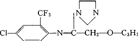 | 释义 | 氟菌唑triflumizole又称特富灵。杂环类杀菌剂。化学名称:2-三氟甲基-4-氯-N-(1-咪唑-1-基-2-丙氧基亚乙基)苯胺。化学结构式如下。原药为白色结晶,熔点63.5℃,100 ml的有机溶剂中溶解度,氯仿中222 g,丙酮中144 g,甲醇中49.6 g,二甲苯中63.9g,乙腈中103 g,25℃水中(pH5.9)溶解度12.5 mg/kg。属广谱性内吸杀菌剂。抑制病菌菌体细胞麦角甾醇的生物合成,阻止病斑扩大和新孢子形成,对病害具预防和治疗作用。可叶面喷洒,种子处理。用于麦类、蔬菜、果树、茶树等多种植物的白粉病、锈病、炭疽病、褐腐病等,对人畜低毒、大鼠急性口服LD50 695mg/kg(♀),715mg/kg(♂)、急性经皮LD50>5 000 mg/kg。对兔眼黏膜有轻度刺激,对皮肤无刺激,在试验剂量内对大鼠无致畸、致突变、致癌作用,但对小鼠可能导致肿瘤,对鱼类有毒。人体每日允许摄入量0.0185 mg/kg。
