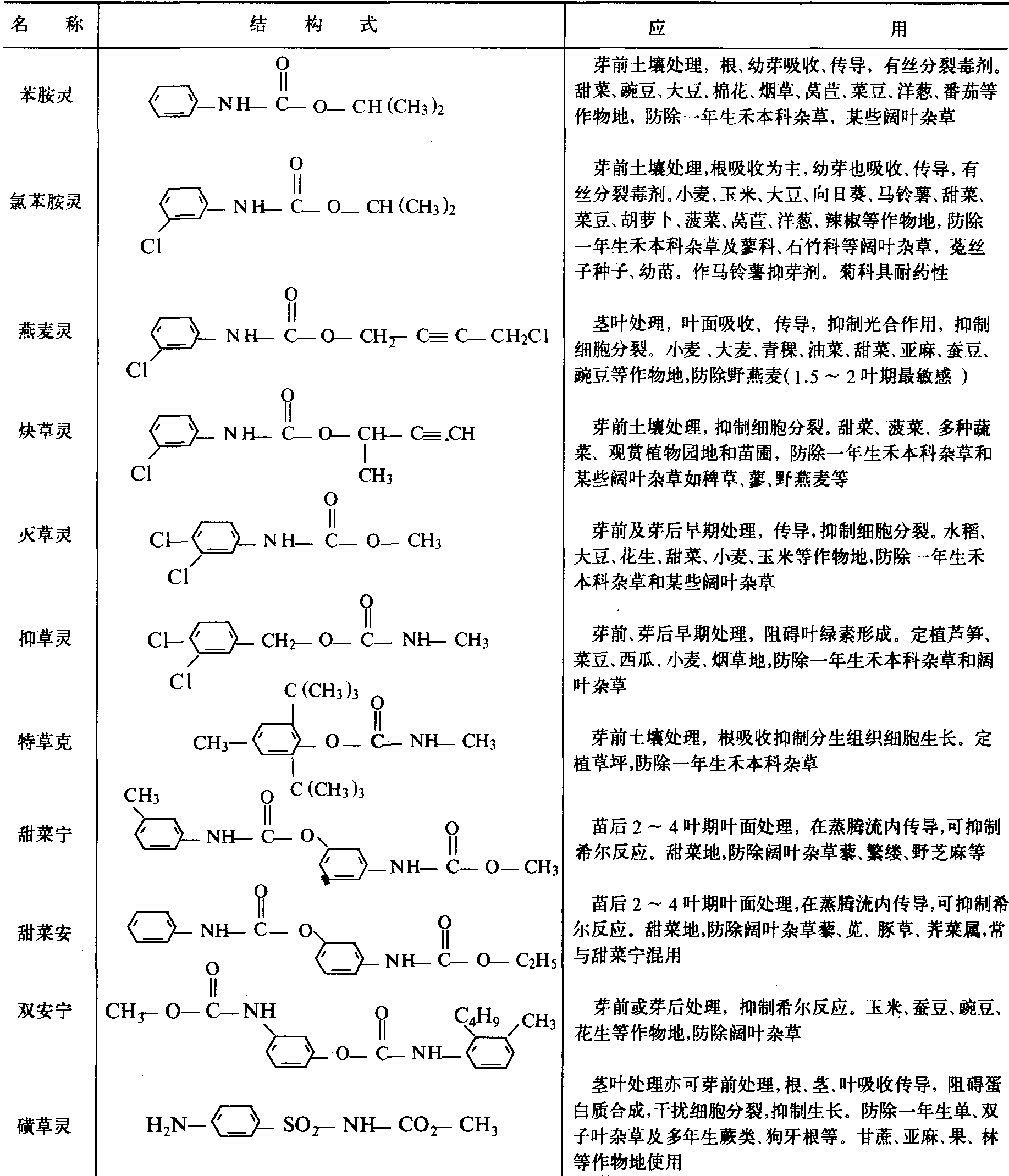 性能 急性毒性低。由于品种不同,吸收部位有差异,大多数品种作土壤处理可被植物幼根与幼芽吸收,部分叶面处理品种则通过茎叶吸收。主要作用部位是植物顶芽及其他分生组织,作用机制主要是抑制细胞分裂与伸长,抑制根、幼芽生长,造成根尖肿大、幼芽畸形。苯胺灵、氯苯胺灵是有丝分裂毒剂,抑制细胞分裂各期的细胞活性,促使染色体收缩,分生组织细胞畸形。燕麦灵抑制野燕麦细胞分裂伸长,导致植株矮化。其次是抑制光合作用和氧化磷酸化作用,干扰蛋白质与叶绿素形成,抑制核酸及若干酶的活性。选择性多由药剂在植物表面滞留、渗入和传导及植物体内代谢速度的差异引起。在耐药性植物体内通过酯键羟基化作用或氨基键的断裂进行水解形成水溶性代谢产物,在多种作物上广泛使用。氨基甲酸酯类在光下比较稳定,光解作用较差,土壤处理的品种通过土壤微生物降解,从土壤中消失,持效期在温暖湿润土壤中约3~6星期。土壤中移动性小。 分类与应用 按结构分为两类:❶苯氨基甲酸酯。氨基甲酸的一个亚氨基氢被苯基(-C6H5)取代,则形成苯氨基甲酸,其酯即为苯氨基甲酸酯,大多数氨基甲酸酯属此类,如苯胺灵。 ❷甲基氨基甲酸酯。氨基甲酸的一个亚氨基氢被甲基(-CH3)取代,则形成甲基氨基甲酸,其酯即为甲基氨基甲酸酯,如抑草灵等。大多数品种作播前、苗前、早期苗后应用防除一年生禾本科杂草及部分阔叶杂草幼芽及幼苗,对成株杂草防效较差。(见表) 氨 基 甲 酸 酯 除 草 剂 主 要 品 种