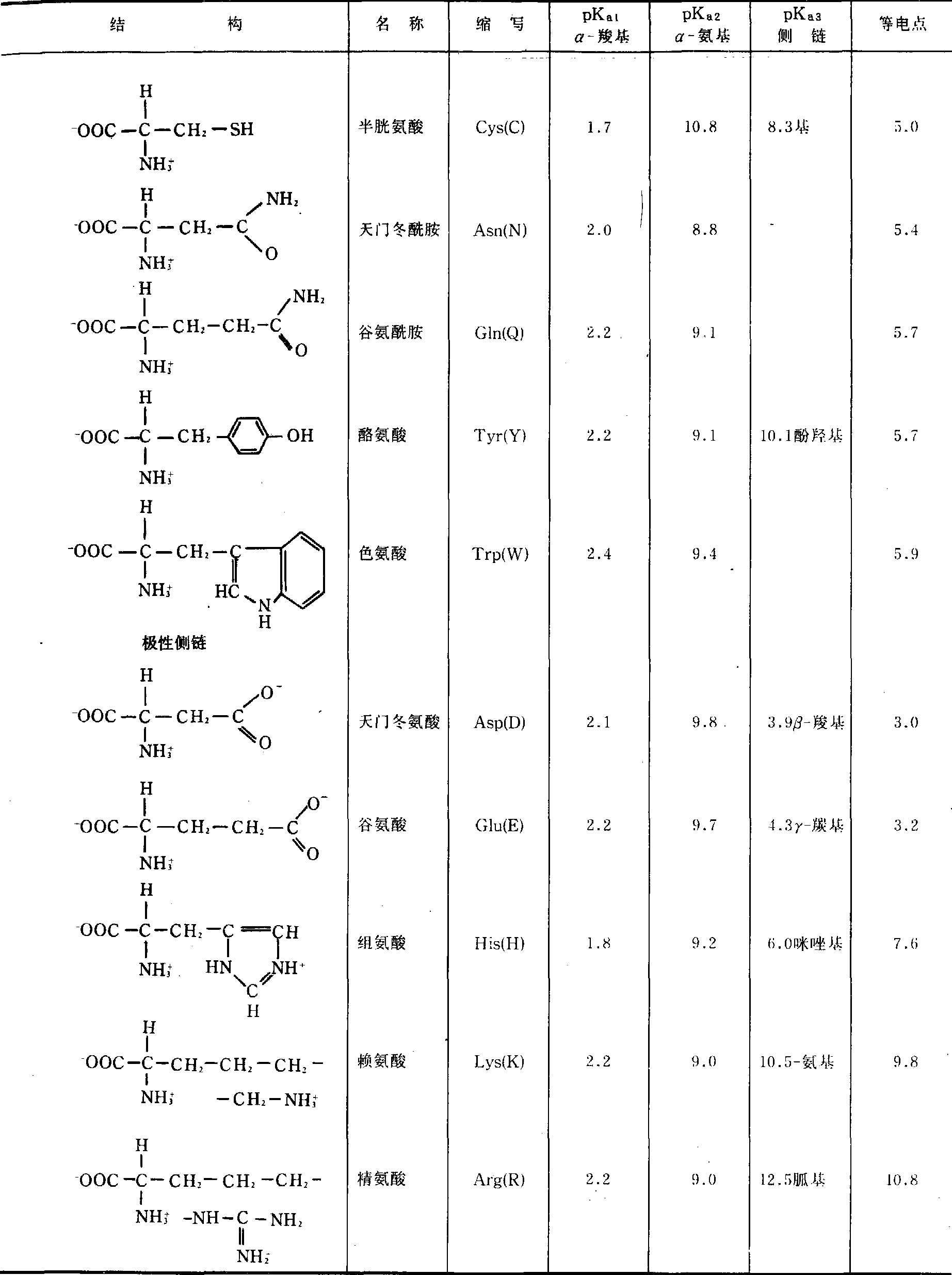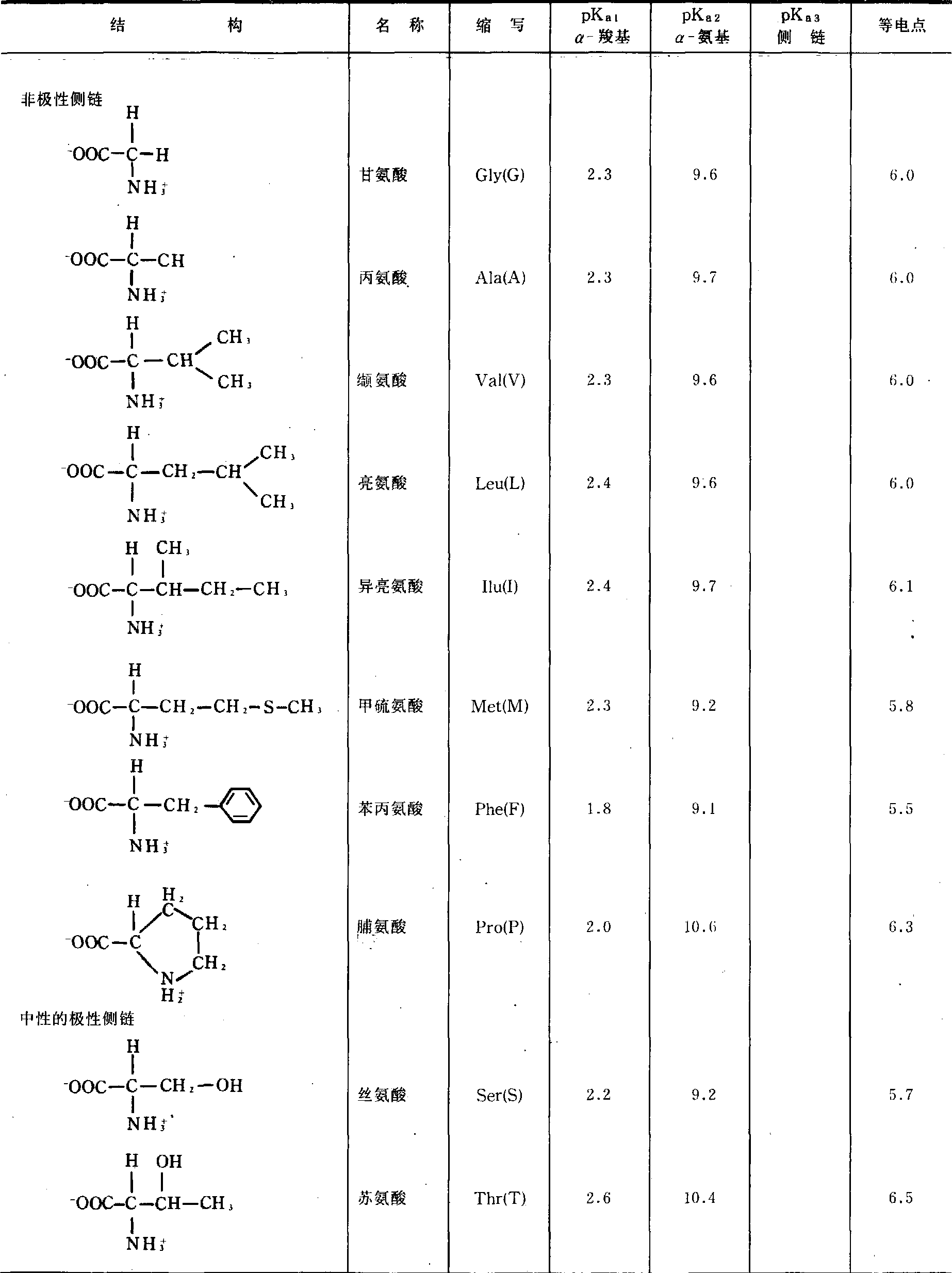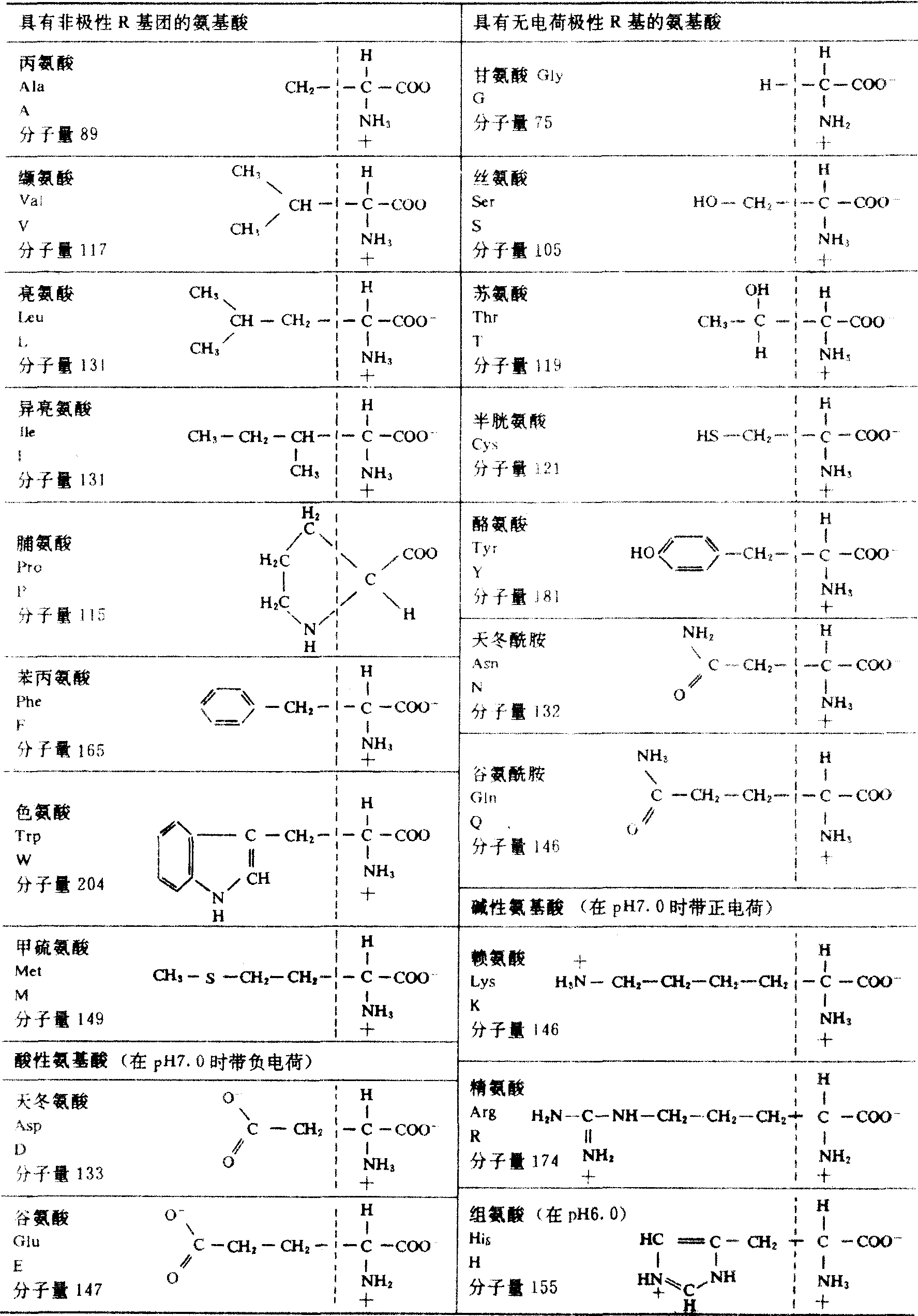 结构 按照α-氨基酸中侧链R基的极性性质,组成蛋白质的20种常见氨基酸可分4组: ❶R基为非极性的氨基酸。共有8种,5种带有脂肪族侧链,即丙氨酸、亮氨酸、异亮氨酸、缬氨酸和脯氨酸,2种为芳香族氨基酸,即苯丙氨酸和色氨酸,一种为含硫氨基酸,即甲硫氨酸;本组氨基酸在水中的溶解度比极性R基氨基酸小;脯氨酸与一般α-氨基酸不同,它是α-氨基酸上的侧链取代了氨基酸上的一个氢原子所形成的,实际上是亚氨基酸。 ❷R基有极性但不具有电荷的氨基酸。共有7种,即R基有羟基的丝氨酸、苏氨酸和酪氨酸,R基有巯基的半胱氨酸,R基有酰胺基的谷氨酰胺和天冬酰胺,另一种氨基酸为甘氨酸; 甘氨酸分子无R基,但具有一定的极性,故归于本组; 本组氨基酸侧链中含有不解离的极性基,能与水形成氢键,较易溶于水。 ❸R基带正电荷的氨基酸。共有3种,即赖氨酸、精氨酸和组氨酸; 在pH7.0时携带正电荷,也称碱性氨基酸。 ❹R基为带负电荷的氨基酸。共有2种,即谷氨酸和天冬氨酸; 在pH7.0时分子带负电荷,也称酸性氨基酸。20种氨基酸的结构式,缩写符号和有关常数见表。除上述20种常见的氨基酸外,尚有二碘酪氨酸、甲状腺素、羟脯氨酸、羟赖氨酸等见于某些蛋白质中。除了参与蛋白质组成的氨基酸外,还在各种组织和细胞中找到200多种其他氨基酸,这些氨基酸大多是组成蛋白质的那些α-氨基酸的衍生物。但是,有一些是β-、γ-或δ-氨基酸,并且有些是D型的氨基酸,如β-丙氨酸、γ-氨基丁酸以及在抗生素短杆菌肽-S中的苯丙氨酸、革兰阳性细菌细胞壁中的D-丙氨酸和D-谷氨酸。有些非蛋白氨基酸在代谢上作为重要的前体或中间产物,其中β-丙氨酸是维生素泛酸的前体,瓜氨酸及鸟氨酸是合成精氨酸的前体,γ-氨基丁酸是神经传导的化学物质。植物含有非常多的非蛋白氨基酸,属于植物次生物质,如茶氨酸、南氨酸、刀豆氨酸、黎豆氨酸和β-氰丙氨酸等。 性质 除甘氨酸外,所有α-氨基酸中的α-碳原子是一个不对称碳原子,因此具有旋光性。氨基酸的旋光符号和大小取决于它的R基性质,并且与测定时溶液pH有关。参与蛋白质组成的20种氨基酸中,酪氨酸、色氨酸和苯丙氨酸具有光吸收能力,这是利用紫外分光光度法(在波长280nm处)测定蛋白质浓度的基础。氨 蛋白质中常见氨基酸的结构、pKa值和pI值