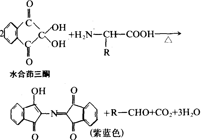 反应 氨基酸的氨基可与强氧化剂亚硝酸起反应,放出氮气,这是定量测定氨基酸中α-氨基的重要反应。氨基酸的氨基与酰化试剂 (酰酐) 在碱性溶液中作用时,氨基可被酰化。氨基可与水合茚三酮作用而生成紫色化合物,两个亚氨基酸-脯氨酸与水合茚三酮反应形成黄色化合物。水合茚三酮反应广泛地用于氨基酸的定量测定。氨基酸的α-氨基与2,4-二硝基氟苯(DNFB)在弱碱性溶液中作用生成二硝基苯氨基酸,用此反应可鉴定多肽链的氨基。另外,利用α-氨基与异硫氰酸苯酯的化学反应可进行多肽和蛋白质中氨基酸顺序分析。氨基酸的羧基能与醇类化合物发生酯化反应,也可经化学的或生物学的脱羧反应,形成相应的胺类化合物。个别氨基酸的颜色反应可用于这些氨基酸的定性和定量分析。常用的有米伦氏反应——当酚化合物与Hg(NO3)2共热使呈红色,含有酪氨酸的蛋白质都有此反应; 坂口反应——在碱性溶液中,胍基与含有α-萘基和次氯酸钠的试剂反应呈红色,精氨酸及含有精氨酸的蛋白质均有此反应; 亚硝基亚铁氰酸盐试验——半胱氨酸及含有自由巯基的蛋白质,在稀氨溶液中能与亚硝基亚铁氰酸钠〔Na2(NO)Fe-(CH)5·2H2O〕反应呈红色; 乙醛酸反应——吲哚衍生物与一些芳香乙醛反应产生有色物质,该反应可用于定量测定蛋白质中的色氨酸; Pauly反应——在碱性溶液中,组氨酸和酪氨酸与重氮化的磺氨酸偶联呈红色; 醋酸铅反应——二硫键或巯基与醋酸铅可反应生成黑色的硫化铅沉淀,此反应可检测蛋白质中的半胱氨酸和胱氨酸。 氨基酸Anjisuan分子中含有氨基(-NH2)和羧基(