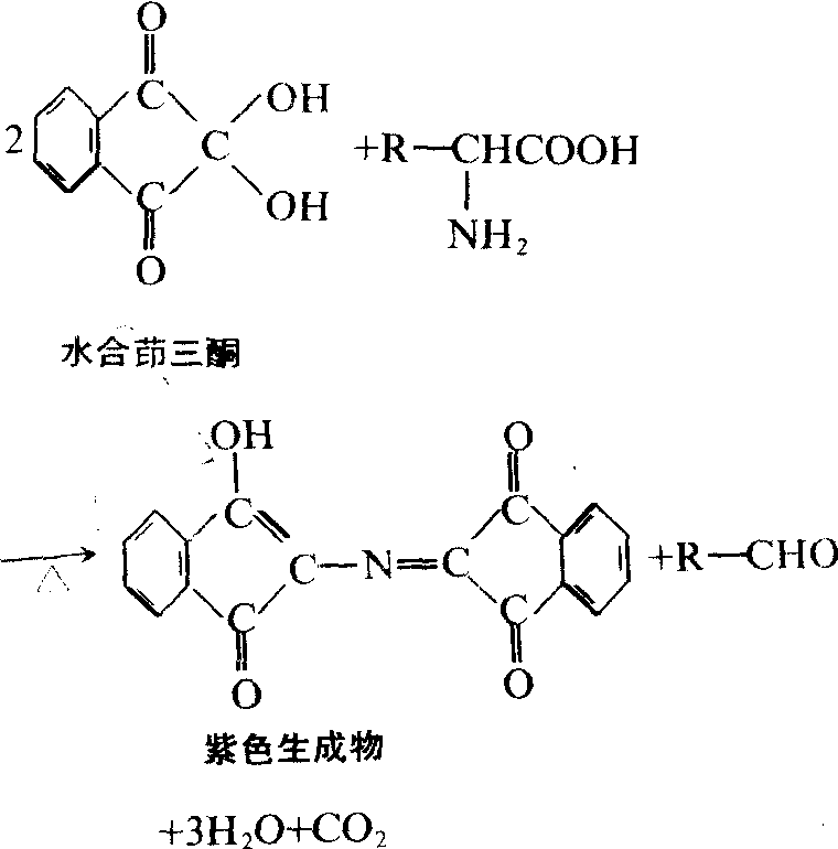 | 释义 | 氨基酸的显色反应anjisuan de xianse fanying凡是具有游离氨基的氨基酸 (α希-氨基酸) 能与茚三酮试剂反应,生成紫色化合物。这种反应非常灵敏,是鉴定α-氨基酸 (除脯氨酸外) 的最简便、最迅速的方法,可用于α-氨基酸的比色测定和纸上层析的显色。多肽和蛋白质也能有此反应: