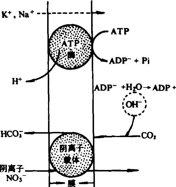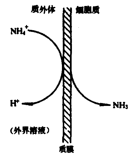 NH+4的吸收 吸收机制还不完全清楚,弟健吉勒(Dejaegere)等学者认为NH+4是与H+交换而被吸收。NH+4最初由细胞壁所吸收,沿着电化学势梯度被动地进入细胞。NH+4的膜渗透性比其他阳离子高得多,进入根系比其他阳离子快。它可与阴离子如SO24同时吸收,也可与质子(H+)交换而被吸收;而质子是借助于质子泵主动地从细胞中泵出。 K. 门格尔等学者认为NH+4是以NH3的形态而被吸收。其吸收机理可能是当NH+4与质膜接触时进行脱质子化,使H+仍留在膜外溶液中,而 NH3扩散到膜内,进入细胞质中(图2)。在细胞质内通常pH条件下,NH3可以再质子化,NH3的再质子化的过程是随NH+4的梯度被动进行的。