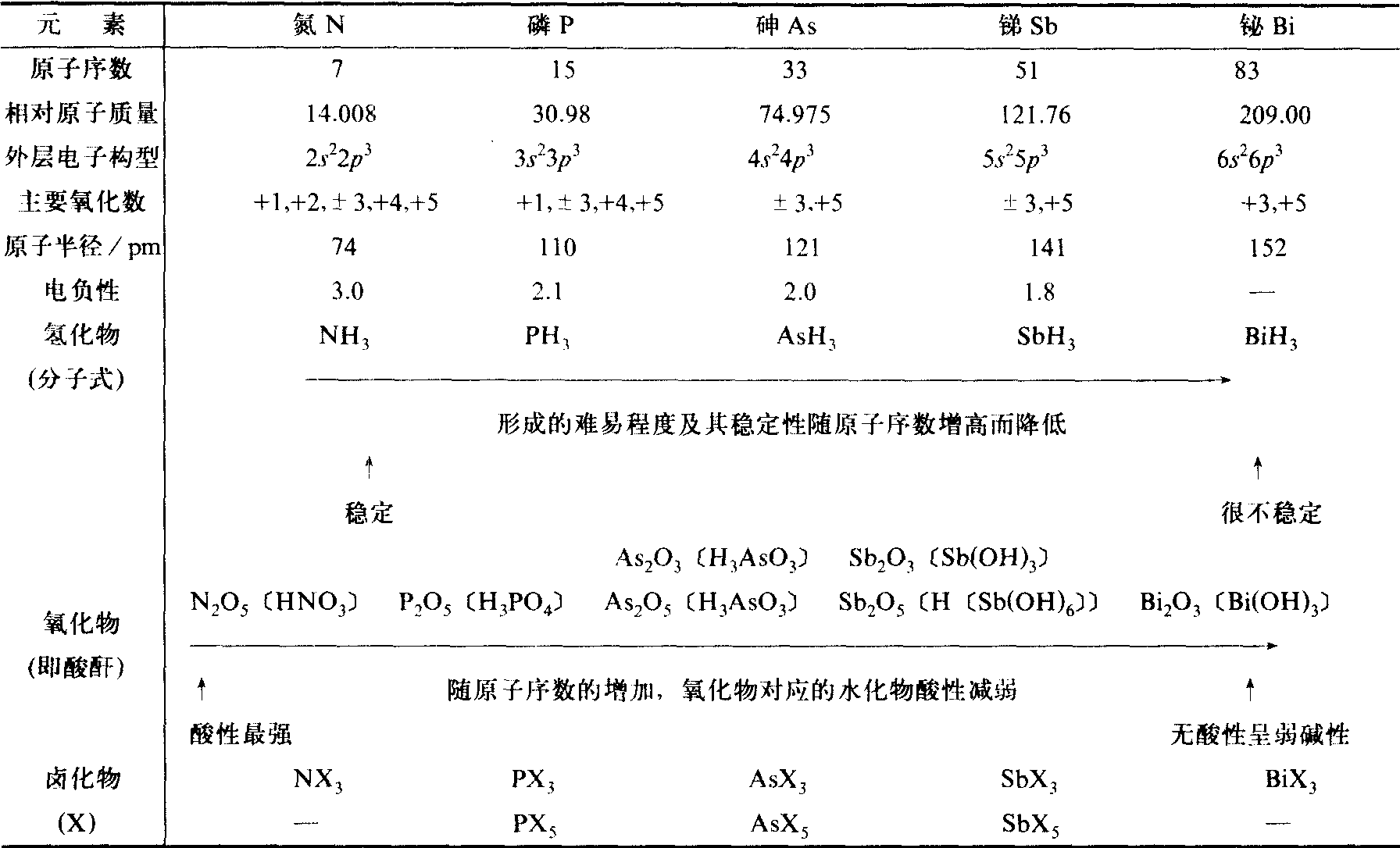 3-的简单水合离子。一般是与电负性较小元素化合形成氧化数为-Ⅲ价的共价化合物,这种趋势从氮到铋逐渐减小。除氨外,其他二元氢化物均不稳定。而本族元素形成正价趋势较强,与电负性较大的元素主要形成氧化数为+Ⅲ,+Ⅴ的共价化合物。在它们氧化数为+Ⅲ的化合物内,化学键只包括3个p电子,氧化数为+Ⅴ,则包括s和p电子。由于“惰性电子对”效应,随原子序数增加,2个6s电子特别稳定,由磷到铋表现为+Ⅲ价的特性逐渐增强。+Ⅲ价铋的化合物在溶液内可产生离子。+Ⅲ价化合物比+Ⅴ价的稳定。氮、磷常见是+Ⅴ价化合物。砷、锑的+Ⅲ,+Ⅴ价化合物都是常见的。氮族元素单质的物理性质见表2。