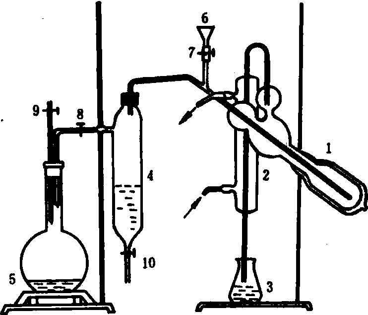 1.蒸馏瓶;2.冷凝器;3.承受瓶;4.分水筒;5.蒸气发生器;6.加碱小漏斗;7、8、9.螺旋夹子;10.开关 扩散法 用扩散皿(即Conwag皿)进行。扩散皿分为内外两室(图2),外室盛放消化液,内室盛硼酸溶液;加碱液于外室后,立即密封,使氨扩散被吸收在硼酸中,最后用酸滴定。扩散法的准确度和精密度与蒸馏法相似,但扩散法设备简单,试剂用量少,操作方便,适于大批量样品分析。