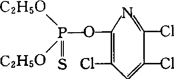 | 释义 | 氯吡磷chlorpyrifos又名乐斯本、毒死蜱、Dursban、Dowco179、Lorsban、Brodan。广谱性有机磷杀虫、杀螨剂。化学名称:O,O-二乙基-O-(3,5,6-三氯-2-吡啶基)硫逐磷酸酯。化学结构式如下。工业纯品为无色粒状晶体,熔点42~43.5℃,25℃时蒸气压2.5 mPa、25℃时水中溶解度2 mg/L、丙酮6.5 kg/kg、苯7.9 kg/kg、氯仿6.3 kg/kg、甲醇450 g/kg。在水中随pH值及温度增加而水解也加快,室内pH8及25℃水解50%1.5天。主要是触杀和胃毒杀虫作用兼有熏蒸作用无内吸作用。可以防治麦蚜、稻飞虱、稻叶蝉、蓟马、稻纵卷叶螟、棉铃虫、棉红铃虫、菜青虫、黏虫、柑橘潜叶蛾、山楂叶螨、棉叶螨等。急性口服LD50大鼠为135~163 mg/kg、豚鼠为500 mg/kg、小鸡为32 mg/kg、兔为1 000~2 000 mg/kg。经皮LD50兔为2 000 mg/kg,2年饲喂试验无作用剂量(NEL),大鼠0.03mg/(kg·d)、狗0.01 mg/(kg·d)。鱼毒LC50鲤(48 h) 0.13mg/kg属高毒。
