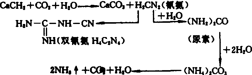 在多数土壤中,都能进行上述反应;但在酸性或微酸性土壤中,所生成的CaCO3和Ca(OH)2不断被土壤酸所中和以外,CaO (HCN2)2还能直接与土壤胶体上的氢离子进行反应,即Ca(HCN2)2+ ![]() +2H2CN2,故其转化速更快。 所以石灰氮通常只用于酸性土壤。石灰氮属强碱性氮肥,不宜在碱性土壤上施用。在碱性(含石灰性)土壤中,由于CaCO3和Ca(OH)2等碱性物质的积累,石灰氮不仅转化缓慢,而且转化中间产物游离氰氨还会进一步聚合成为不易分解、且植物难以利用的双氰氨。反应式如下: