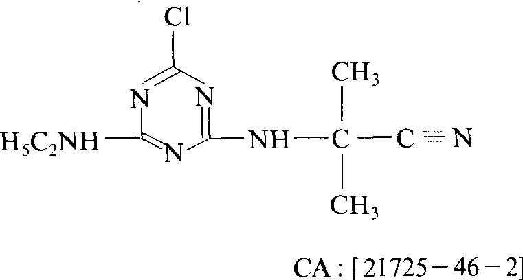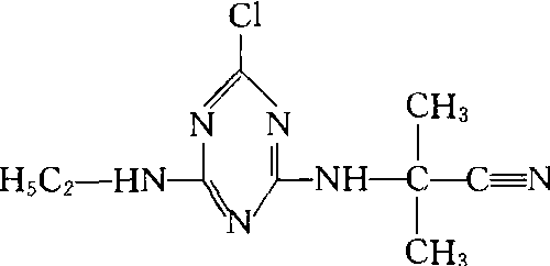 性能 纯品为白色结晶,熔点166.5 ~167℃,20℃时蒸气压为199.98×10-9帕,25℃水中溶解度为171毫克/升,乙醇中为45克/升,氯仿中为210克/升,对光和热很稳定。在中性、微酸性或微碱性介质中可水解。大鼠口服LD50为 182 ~ 288毫克/千克,在哺乳动物体内迅速被代谢和排出,对虹鳟鱼LC50为5毫克/升。 氰草津主要被根吸收,也可通过叶部吸收,通过抑制光合作用发挥除草活性,使杂草死亡。玉米体内含有酶使其水解或形成轭合物而丧失毒性,使玉米安全。土壤粘粒能吸附氰草津,在土壤中的移动性比西马津大,在潮湿的土壤中半衰期为14~16天,持效期2~3个月,比莠去津降解快对后茬小麦的种植无影响。土壤中微生物能分解本剂。 应用 氰草津适用于玉米、豌豆、蚕豆、马铃薯、棉花等作物地中,防治多种一年生禾本科和阔叶杂草,施药时期为播种后出苗前,土壤喷雾处理或苗后杂草2~4叶期茎叶喷雾。土壤处理每公顷1.8~2.4千克,叶面茎叶喷雾1.2~2.0千克。可与莠去津混用,以扩大杀草谱和缩短残留期。土壤湿润有利于药效的发挥,春天土壤干旱时,施药后浅耙混土有利药效的发挥。 氰草津cyanazine又称百得斯、草净津。三氮苯类内吸、选择性除草剂。化学名称:2-氯-4-(1-氰基-1-甲基乙胺基)-6-乙胺基-1,3,5-三氮苯。化学结构式如下。原药为白色结晶固体,熔点166.5~169℃,20℃时蒸气压为213.3×10-9 Pa,不易挥发,微溶于水,易溶于乙醇、三氯甲烷、苯、甲基环己酮等有机溶剂,对光和热稳定,在中性、微酸性或微碱性介质中水解。药剂可通过根及叶面吸收,抑制光合作用,使植物饥饿死亡。可用于玉米、小麦、大麦、蚕豆、豌豆、马铃薯及甘蔗田,防除一年生禾本科杂草和阔叶杂草。对人、畜中等毒性,大鼠急性口服LD50为182~334 mg/kg,兔急性经皮LD50>2 000 mg/kg。