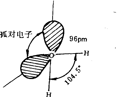 图1 水分子结构 由于水分子不存在对称中心,也没有两个对称元素相交于 一点,故水是极性分子,偶极矩 (6.17×10-30C·m) 仅次于氟化氢。在水分子中,氧的电子负性很高,其上又有孤电子对,故可借氢键形成缔合分子