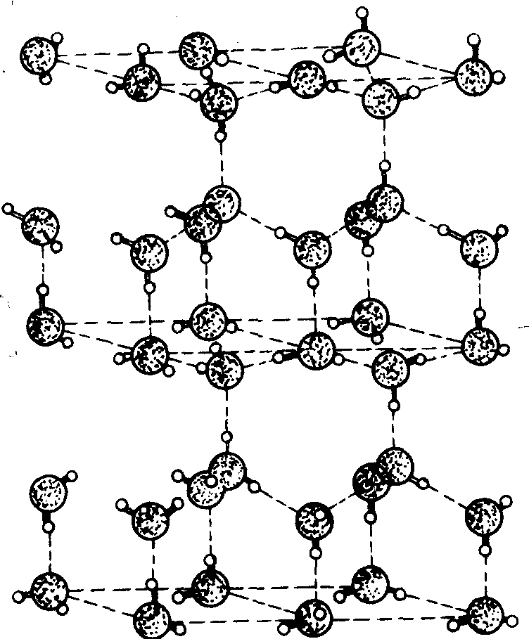 图 2 冰的结构 水的这一性质对水生动植物的生存有着重要意义。❸水在1×105Pa下,100℃时沸腾,因在汽化时要消耗较多的能量破坏缔合分子,故沸点时水的汽化热较大为2.257 kJ·g-1。水的介电常数很高 (78.3) ,使水成为良好的溶剂。水是非常活泼的物质,自电离性很小,但却极为重要,一个水分子可离解为一个正氢离子H+及一个负氢氧根离子OH-,且反应是可逆 H2O