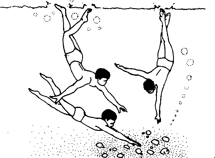 游戏方法 把学生分成4组,站成一个正方形,左右间隔1米。预备时,教师把石球撒在方形水域中间。游戏开始,学生深吸一口气,以头朝下潜入水中,寻找石球。最后以摸到的石球多的组为胜。 游戏规则 ❶下潜时不要拉绊别的同学。 ❷允许换气后再潜入水底寻球。 |