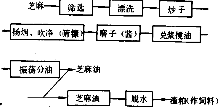 水代法制油的基本工艺过程(见图): ❶筛选。采用双层振动平筛以去除茎杆、草屑、细砂等大小杂物的工序。